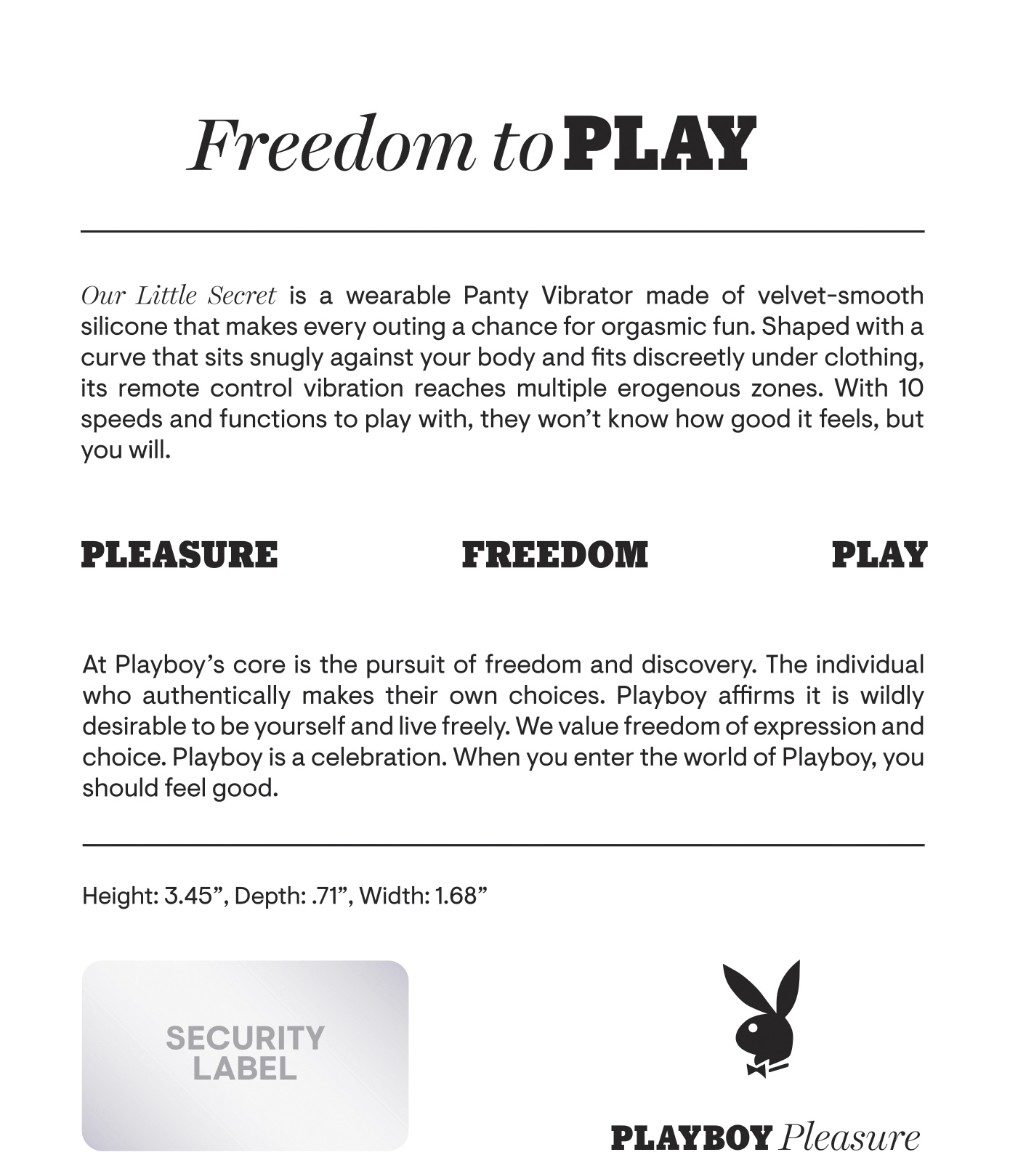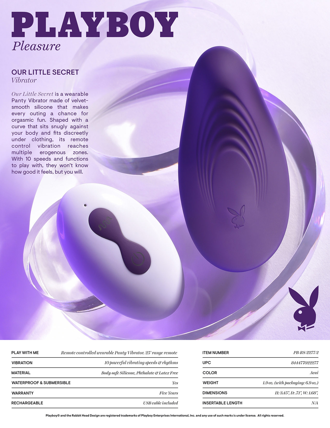 Playboy Our Little Secret Panty Vibrator from Evolved Novelties. The freedom to play is yours with Playboy Pleasure. Our Little Secret is a wearable Panty Vibrator made of velvet smooth Silicone that makes every outing a chance for orgasmic fun. Shaped with a flexible curve that sits snugly against your body and fits discreetly under clothing, its remote control vibration reaches multiple erogenous zones. With 10 low noise speeds and functions to play with, they will not know how good it feels, but you will. Features: Remote Controlled Wearable Panty Vibrator. Materials: Body safe Silicone, Phthalate free, Latex free. Size height 3.45 inches, depth .71 inch, width 1.68 inches. Insertion length 2 inches, diameter 1.68 inches. 10 vibrating speeds and rhythms. Press power button on vibrator for 3 seconds to turn on/off. USB Rechargeable. 60 minutes battery life.Charge time 90 minutes. Remote Control included. 25 feet range. Remote control uses 1 CR2032 battery. Vibrator is waterproof for play outside the bedroom. Submersible for easy cleaning and water play. 5 years manufacturer’s warranty. Clean before and after use. Rinse with warm water. Pat dry before storing. Only use a water based personal lubricant. Please note panties are not included. Categories: Vibrators, Clitoral Stimulators, Rechargeable Vibrators, Sex Toys for Women, Clit Cuddlers, Vibrating Underwear. Play with me. Playboy and Rabbit Head design are registered trademarks of Playboy International. All rights reserved. 2023.