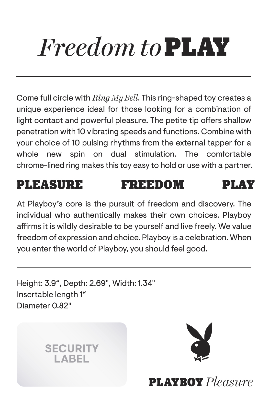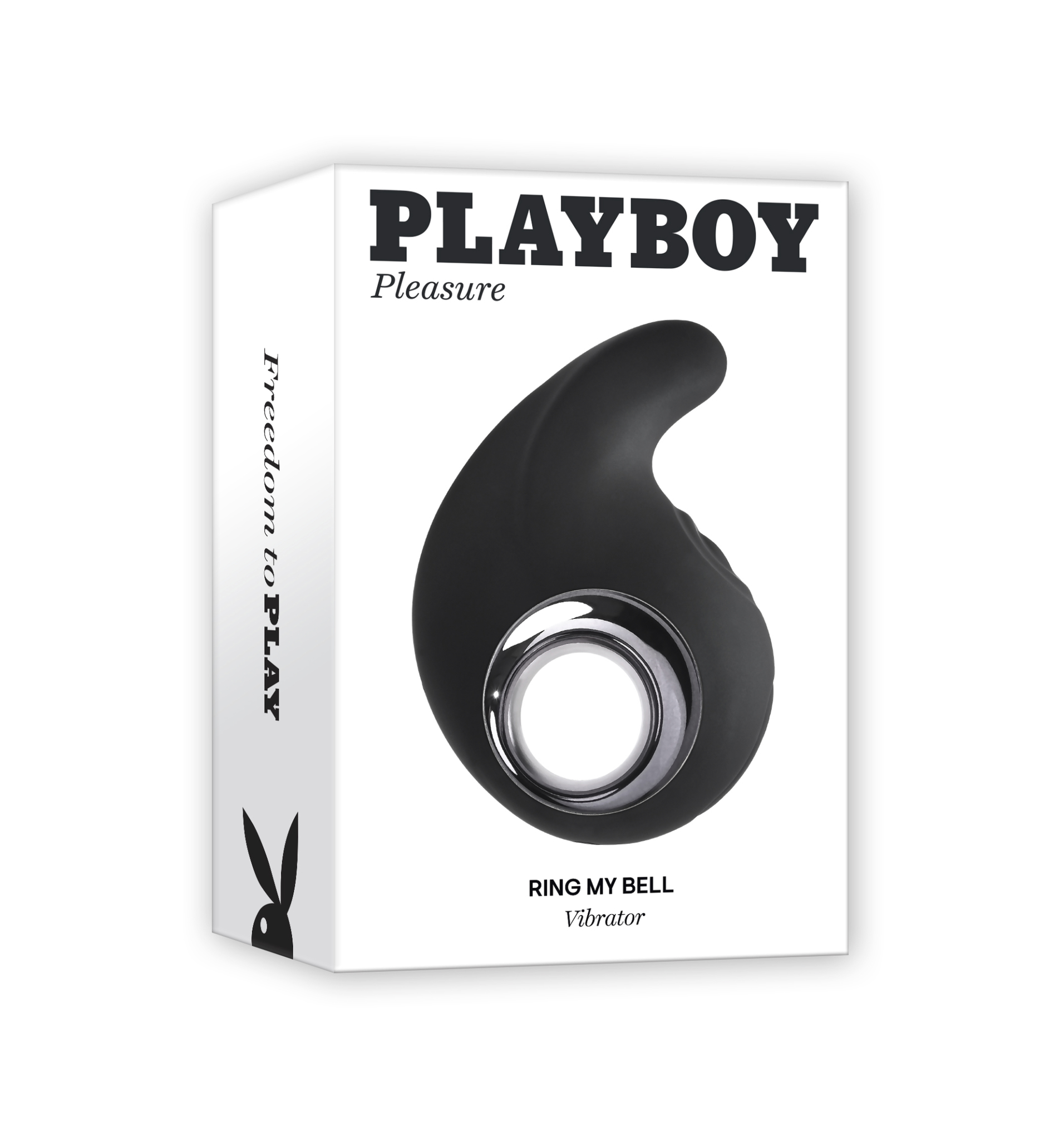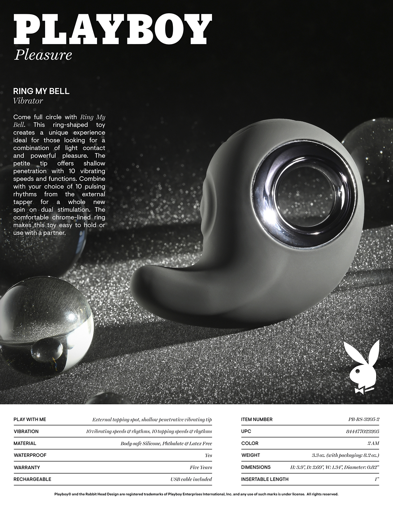 Playboy Pleasure Ring My Bell Vibrator from Evolved Novelties. Freedom to Play: come full circle with Ring My Bell. This Ring shaped toy creates a unique experience ideal for those looking for a combination of light contact and powerful pleasure. The petite tip offers shallow penetration with 10 vibrating speeds and functions. Combine with your choice of 10 pulsing rhythms from the external tapper for a whole new spin on dual stimulation. The comfortable chrome lined Ring makes this sex toy easy to hold or use with a partner. Play with me key feature: external tapping spot, shallow penetrative vibrating tip. Vibration: 10 vibrating speeds and rhythms, 10 tapping speeds and rhythms. Material: body safe Silicone, phthalate free and latex free. Waterproof vibrations. 5 years warranty. Rechargeable via a USB cable, included. Size height 3.9 inches. Depth 2.69 inches. Width 1.34 inches. Insertable length 1 inch, insertable diameter 0.82 inch. Categories: Vibrators, Clitoral Stimulators, Sex Toys for Couples, Love Rings, Rechargeable Vibrators, Clit Cuddlers. 2 A.M. color. Playboy and Rabbit Head design are registered trademarks of Playboy International. All rights reserved. 2023.