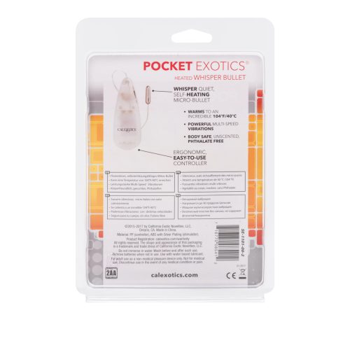 Pocket Exotics Heated Whisper Bullet Vibrator from California Exotic Novelties. The sleek and petite Pocket Exotics Heated Whisper Bullet is a powerful micro-stimulator for intimate arousal, stimulation and climax fun wherever you go. The compact pocket friendly massager comprises of mini bullet vibrator stimulator with easy to use controls. The discreet heating stimulator measures 1.25 inches by .75 inch and is made from durable Silver Plated ABS Plastic. The stimulators powerful, pleasurable tingles and sensations are operated via a tear drop shaped Polypropylene PP controller that requires 2 AA batteries to power up the fun. Once activated, the pocket sized personal massager delivers intensely satisfying vibration and pulsation functions that heat up to an incredible 104 degrees Fahrenheit F or 40 degrees Celsius C. Use the micro massager to ease tension anywhere on the body, and to arouse and stimulate the super sensitive erogenous zones. The discreet travel sized stimulating bullet is perfect for the first time and experienced users and easily slips into your pocket or purse for intimate play on the move. For maximum sensual pleasure and longer lasting satisfaction, always use a quality lube with this toy. Before and after every use, clean the bullet stimulator with a toy cleaner spray. Intensely powerful micro stimulator. Warms as it vibrates to an incredible 104 degrees Fahrenheit. Safe and pure for body and pleasure made using Polypropylene PP controller, ABS Plastic with Silver Plating Bullet Vibrator is powered by 2 AA batteries, not included. Bulk weight 1.1 ounces. 1.25 inches by .75 inch. 1 year warranty. Categories: Vibrators, Bullets, Eggs, Sex Toys for Women, Men, Couples, Vibrating Bullets and Eggs, Luxury Items. 2023.