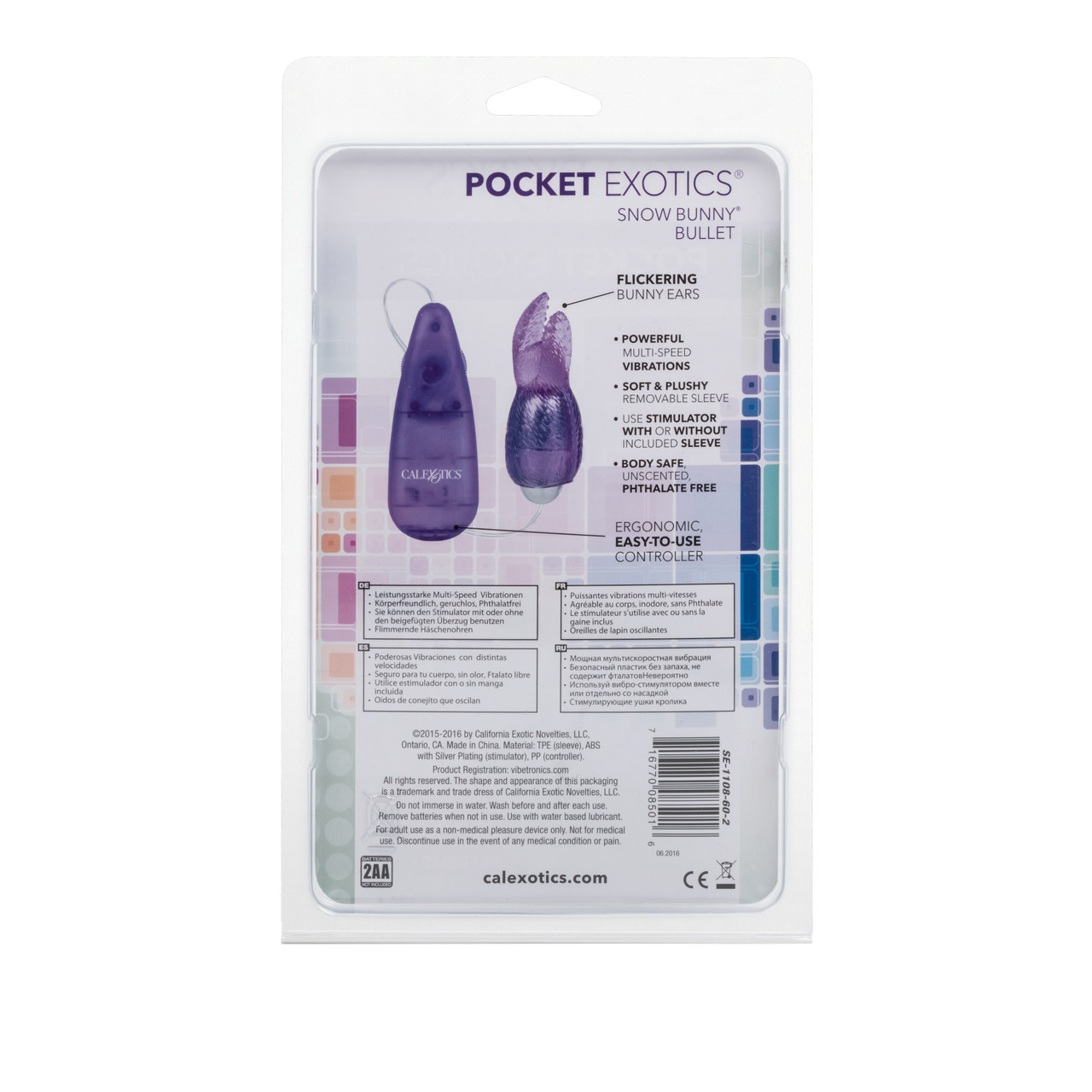 Pocket Exotics Snow Bunny Bullet Vibrator Purple Set from California Exotic Novelties. Voted the #1 Bunny Arouser, Pocket Exotics Snow Bunny Bullet Vibrator comes in a Pretty Purple as sensual as the Vibrating experience it creates. This high intensity Vibrating Bullet with removable, dual action Bunny Teaser comes with a multi-speed Power Pack and plenty of sleek style. It is as safe as it is sensually satisfying and exciting too, with a bunny crafted of Thermoplastic Elastomers TPE, a Controller of Polypropylene PP and the Bullet Vibrator itself of pure ABS Plastic with a Silver Plating. The pleasure is intense with this powerful and gratifying stimulator. It is one smooth, sturdy, sexy, and satiating pleasure Bullet Vibrator. With this Bunny, the pleasure is all yours. Our Bunny Stimulator shoots right to the heart of your heat, serving up new levels of satisfaction. Enjoy it on your own or with a partner – either way, a new sensual adventure awaits. We have what you need for pure enjoyment and sensual fun. Go ahead, get hopping! High intensity Vibrating Bullet with removable, dual action Bunny Teaser. Multi-speed Power Pack. Safe and pure for body and pleasure made using phthalate free materials Thermoplastic Elastomers TPE Bunny Vibrator Sleeve, Polypropylene PP Controller, ABS Plastic with Silver Plating Bullet Vibrator. 4 inches by 1 inch Snow Bunny Sleeve. 2 inches by 1 inch Bullet Vibe. Bulk weight 3.1 ounces. Vibrating sex toy requires 2 AA batteries, not included. Do not leave batteries in the vibrator between uses. Safe and pure for body and pleasure. Made using phthalate free, non-toxic materials Polypropylene PP Power Controller, ABS Plastic with Silver Plating Bullet Vibrator. Always clean before and after use plus between partners. Rinse with warm water. Pat dry before storing. 1 year warranty. Pocket Exotics Snow Bunny Bullet Vibrator is a registered trademark for California Exotic Novelties. Sex toys and sexual wellness. Categories: Vibrators, Bullets, Eggs, Sex Toys for Women, Vibrating Bullets and Eggs. 2023.