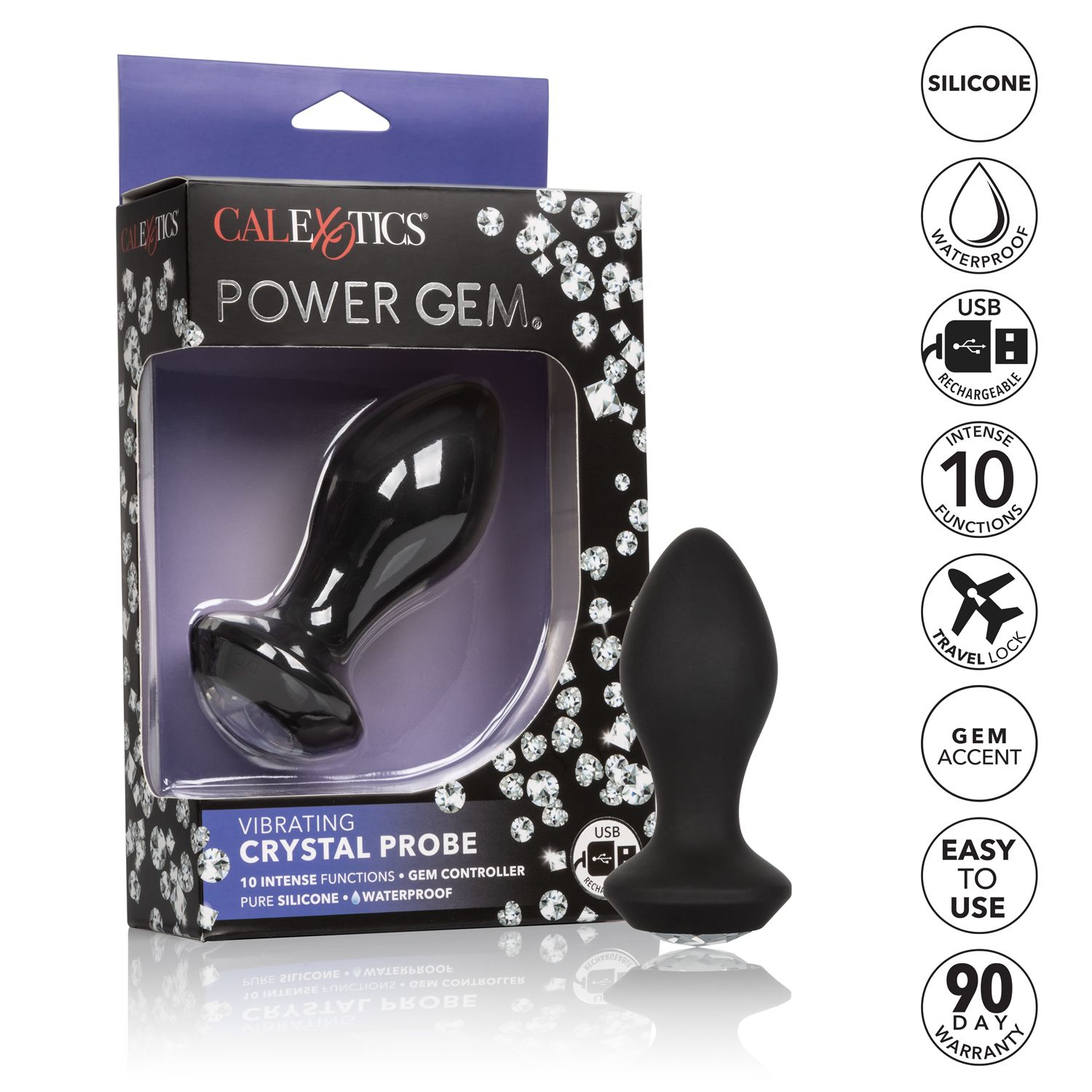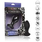 The Power Gem Vibrating Petite Crystal Probe from California Exotic Novelties a dazzling, flexible Silicone Probe created to ease you into thrilling anal pleasure. The pliable, ergonomic design and powerful vibe motors allow this probe to flex with your movements while delivering intense vibrations. Indulge in personalized pleasure while the sleek probe pulsates with 10 vivacious vibration, passionate pulsation and erotic escalation. Control this variety of orgasmic options with the easy touch gem stone button. To ensure everything the exhilarating world of anal play has to offer, we have created a gently tapered probe for the ultimate in comfort and stimulation. The flexible shape and flange base allows for easy insertion and removal, while the intense motor make you shudder with pleasure. Whether you are taking a dip with a lover or indulging in a steamy solo session, look forward to up to 2 hours of waterproof vibration. Recharge pleasure and get back to playtime in only 2 hours with the provided USB cable. Specifications: Color Black. Materials: Silicone Probe, ABS Plastic Gem. Power source USB Rechargeable included. Featuresphthalate free, waterproof, rechargeable, vibrates. 1 year warranty. Maximum run time 120 minutes. Maximum charging time 120 minutes. Measurements 4.25 inches by 1.25 overall. 3.25 inches by 1.25 inches probe. Bulk weight 2.2 ounces. Package weight 5.2 ounces. Package 2 inches by 4.75 inches by 8.5 inches. Categories for the Power Gem: Anal Toys, Small and Medium Butt Plugs, Vibrators, Eco-Friendly Sex Toys, Rechargeable Vibrators. 2023.