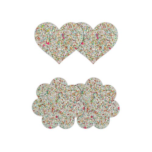 Pretty Pasties Heart and Flower Glow 2 Pairs from NS Novelties. Hearts, Stars, Crosses and more! Pretty Pasties by NS Novelties is a collection of adhesive Nipple covers guaranteed to excite and entice. Comfortable and secure during wear and effortless to place and remove. Available in an assortment of shapes, colors, patterns, and finishes Pretty Pasties are the perfect body decor for a passionate time. Directions: 1. Clean skin with soap and warm water. Dry area completely. 2. Peel off backing. 3. Apply pasty carefully and smooth down. 4. To remove, gently and slowly peel pasties off of skin. Do not pull or rip off quickly. Single use pasties. Brand: Pretty Pasties. Model: NSN-1201-01. UPC: 657447107764. Product weight: 0.92 ounce. Package dimensions: 4.84 inches by 3.35 inches by 0.55 inch. Product material: Glitter Fabric. Categories: Lingerie, Clothing, Sexy Costume Accessories, Nipple Play, Pasties and Accessories. 2023.