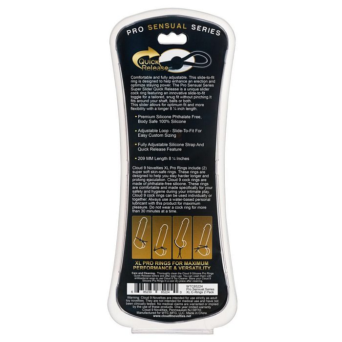Cloud 9 Super Slider Cock Ring With (2) Quick Releases comfortable and fully adjustable. This slide to fit ring is designed to help enhance an erection and optimize staying power. This unique slider cock ring features an innovative slide to fit toggle for a tailored, snug fit without pinching. This larger leash fits around your shaft, balls or both for optimum fit. This longer lease allows for optimum fit and more flexibility with a longer 8.25 inches leash. Premium Silicone phthalate free, body safe 100% Silicone. Adjustable loop slide to fit feature for easy, custom sizing. Silicone strap and quick release feature with 2 fully adjustable quick release. Length 8.25 inches. Cloud 9 Novelties Super Slider Combo Pack includes (2) super soft skin safe rings. These rings are designed to help you stay harder longer and prolong ejaculation. Cloud 9 cock rings are made of phthalate free Silicone. These rings are comfortable and made specifically for your safety and hygiene during your intimate play. Cloud 9 cock rings can be used individually or together. Always use a water based personal lubricant with this product for maximum pleasure. Do not wear a cock ring for more than 30 minutes at a time. Cock ring specifications 100% Silicone phthalate free, body safe. Disclaimer notes and warning: Cloud 9 Novelties are intended for use strictly as adult toy novelties. They are not intended for medical use and have not been clinically tested. No medical claims are warranted or implied by the use of these products. One year limited warranty. Categories: Love Rings, Cock Rings, Adjustable, Versatile Cock Rings, Sex Toys for Couples. Cloud 9 Novelties, Pennsauken NJ 08110. Manufactured for WTC. MFG, LLC. Made in China. Restricted, Amazon Restricted. 2023.