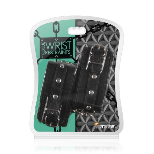 Si Novelties Ignite your passion Risque Wrist Restraints Black. Faux leather cuffs with chain and buckle closures. One size fits most. No release key needed.