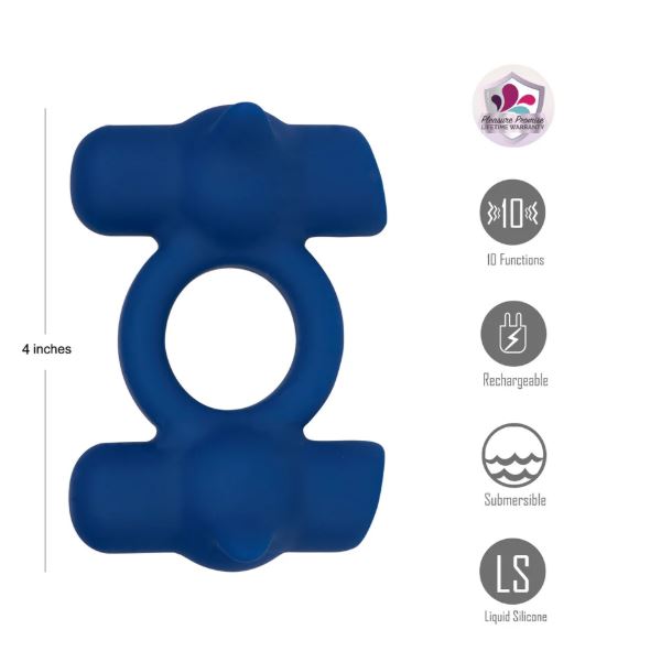 Experience maximum pleasure with the Ronan Vibrating Liquid Silicone C-Ring. Ronan features two powerful Jaguar Powered bullets. The removeable bullets each feature 5 speeds and 5 variable vibration patterns and can be used for solo play. The super-stretchy design ensures a comfortable fit for everyone, while the Dual Ticklers add an extra level of stimulation for your partner.Rechargeable and submersible, Ronan is perfect for water-play. Plus, it comes with a magnetic charging cable for hassle-free power-ups. With our Pleasure Promise Warranty, you can indulge with confidence.FEATURES: Liquid Silicone C-Ring, Two Silicone Coated 5-Speed + 5 Variable Function Bullets, Rechargeable, Diameter 2 inches, Inside Diameter 1 inch, Submersible, Magnetic Charging Cable Included, Pleasure Promise Warranty