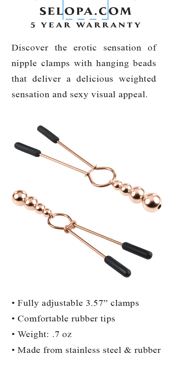 Selopa Beaded Nipple Clamps Rose Gold from Evolved Novelties. Love, sex, passion. Discover the erotic sensation of Nipple Clamps with hanging beads that deliver a delicious weighted sensation and sexy visual appeal. Beaded Nipple Clamps specifications fully adjustable 3.57 inches Nipple Clamps. Comfortable rubber tips. No painful piercing. Made from Stainless Steel and Rubber. Please note do not use oil based lubricant it can corrode the Steel. Categories: Bondage, Fetish, Kink, Nipple Play, Sex Toys for Women, Bondage Kits, Kinky Sets. 2023.