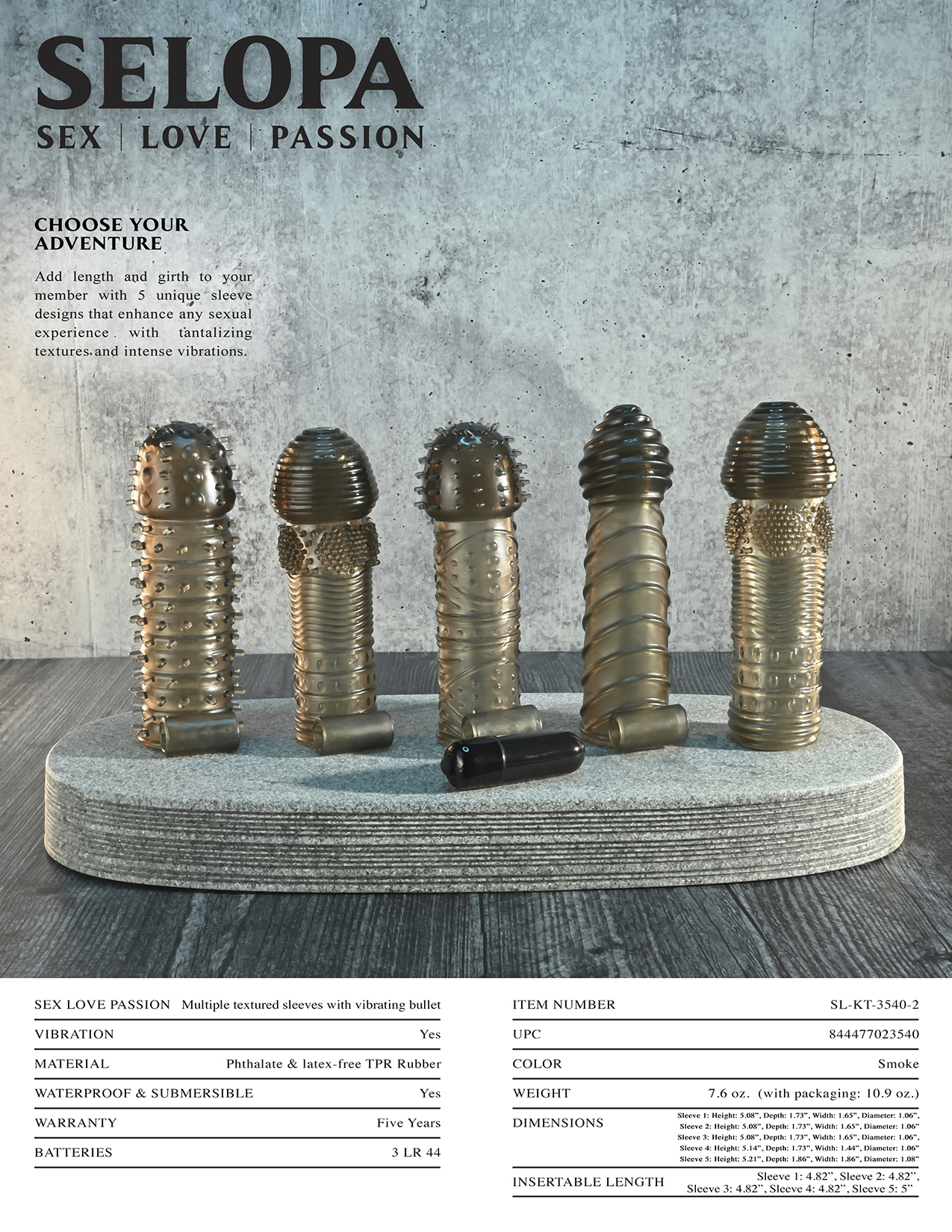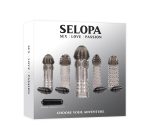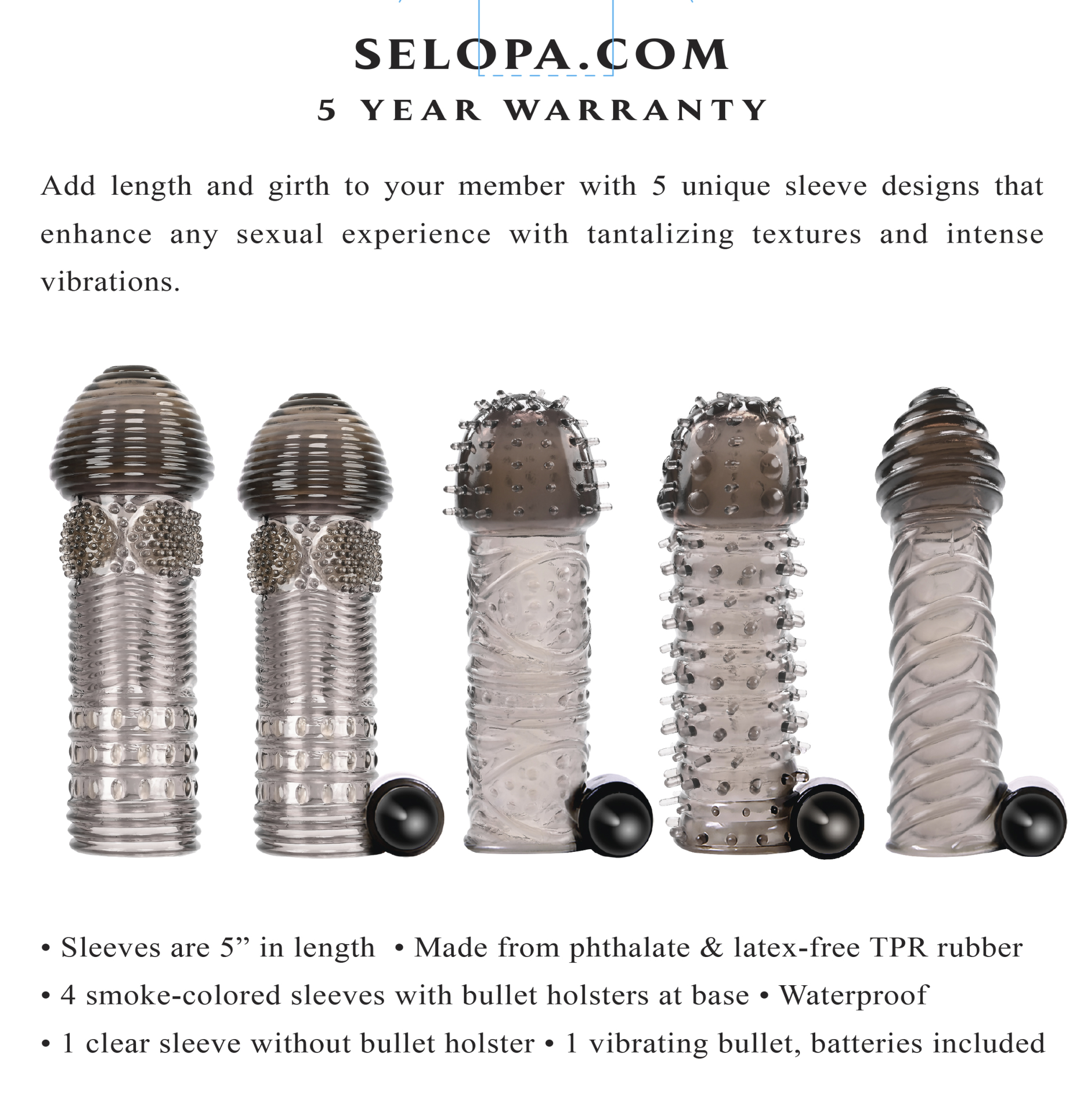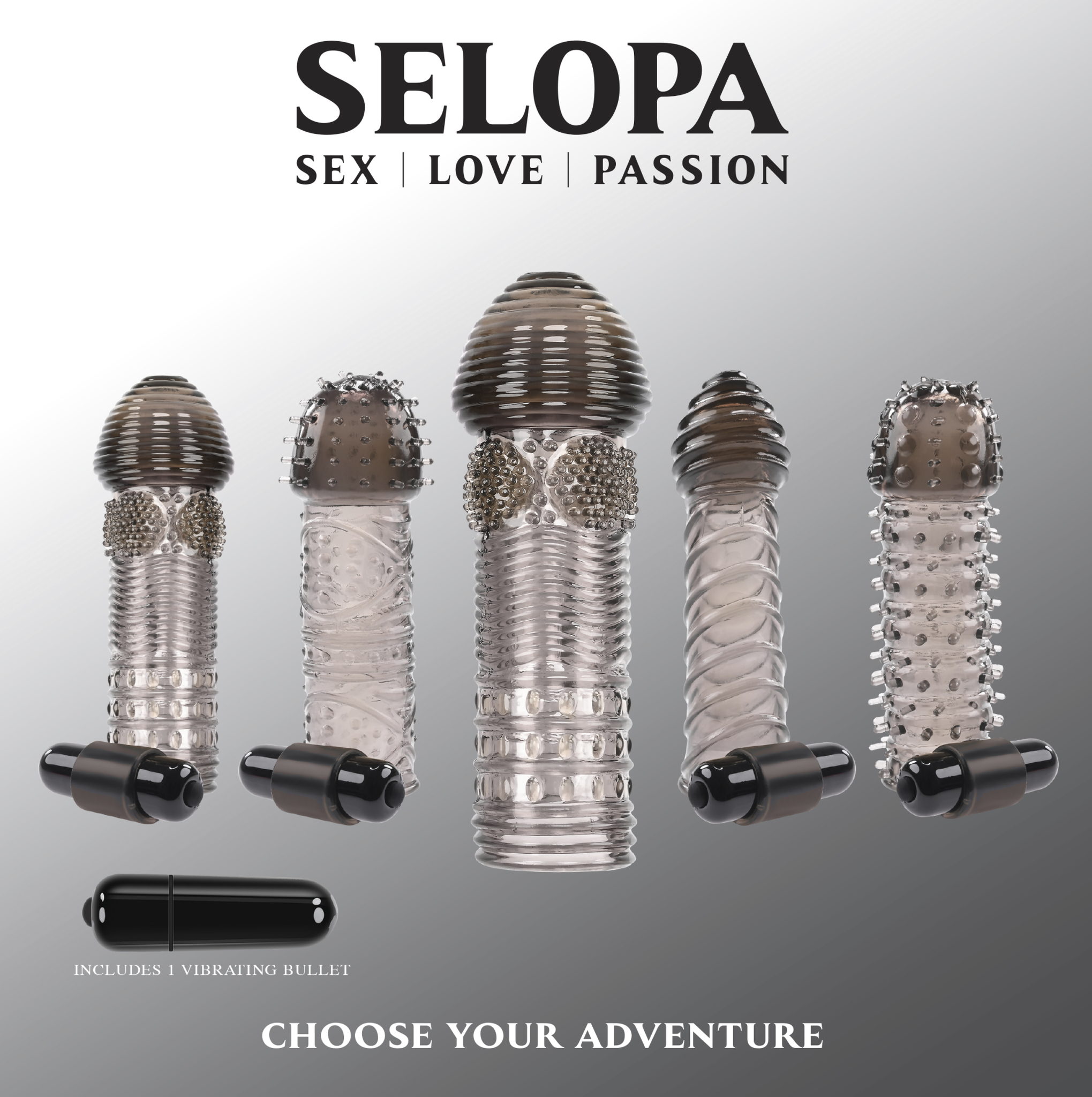 Selopa Choose Your Adventure 5 penis extensions with a vibrating bullet. Each penis sleeve is made using body safe materials phthalate free and latex free Thermoplastic Rubber TPR and the bullet vibrator is made from ABS Plastic. Add length and girth with 5 unique sleeve designs that enhance any sexual experience with tantalizing textures and intense vibrations. Features: sleeves are 5 inches in length. Made from TPR, ABS Plastic. 4 smoke colored sleeves with bullet vibrator hosters at the base of the sleeve. Waterproof. 1 clear sleeve without holster. 1 vibrating bullet with batteries included. Love, sex, passion. Categories: Bullets, Eggs, Sex Toys for Couples, Men, Women, Penis Extensions, Vibrator Sleeves, Vibrating Bullets, Eggs, Male Extensions. 2023.