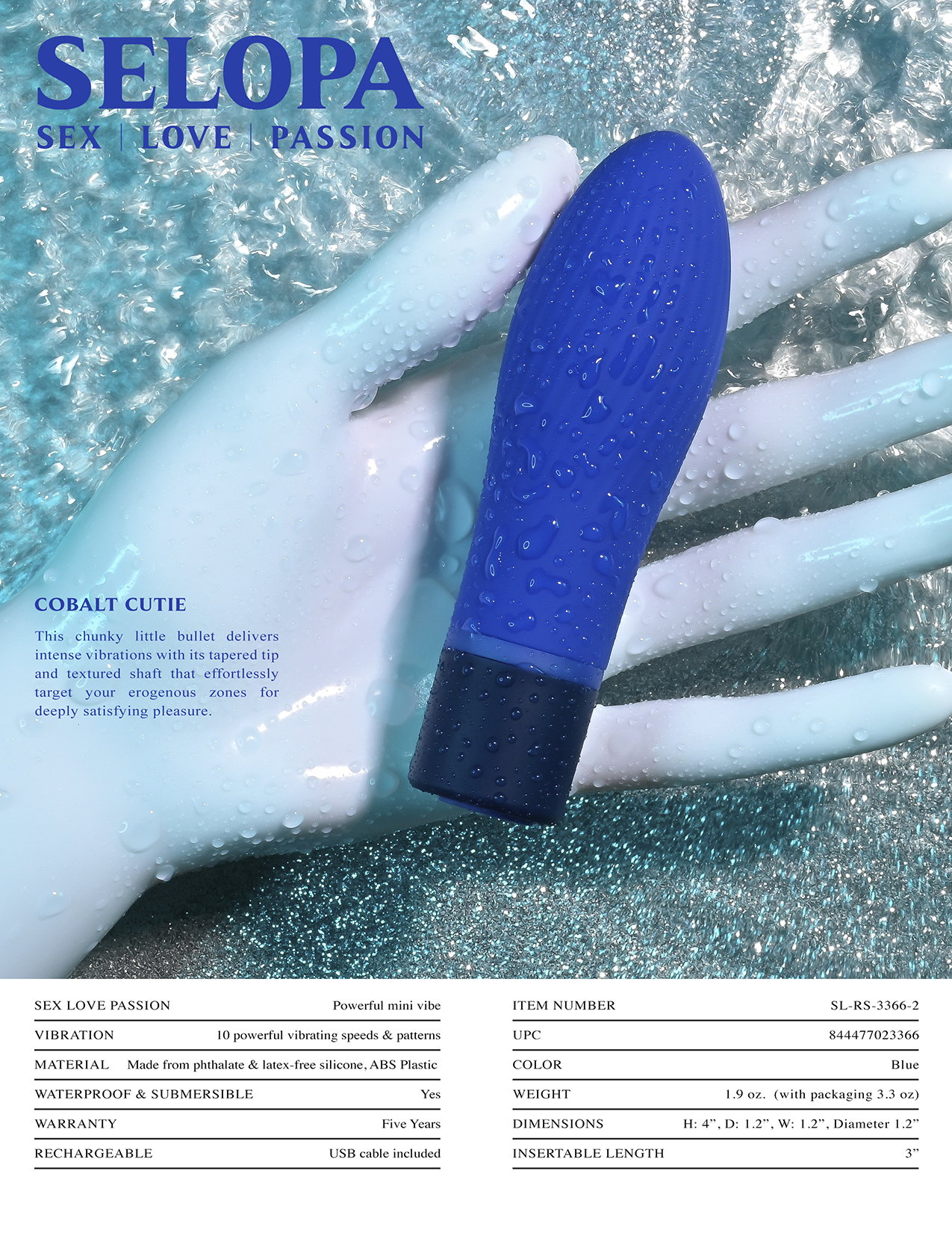 Selopa Love, Sex, Passion Cobalt Cutie Mini Rechargeable Blue Vibrator from Evolved Novelties. Cobalt Cutie is a chunky little Bullet Vibrator delivers intense vibrations with its tapered tip and textured Shaft that effortlessly target your erogenous zones for deeply satisfying pleasure. Sex, Love, Passion features of the Cobalt Cutie: powerful mini vibe. Vibration: 10 powerful vibrating speeds and patterns. Materials made from body safe phthalate free and latex free Silicone, ABS Plastic. Waterproof vibrations and submersible for play outside the bedroom. 5 years warranty.Rechargeable Vibrator via a USB port, charging cable included. The USB has a magnetic cable. Easy to charge no point or plug in for quick recharging. The magnets are on the bottom of the sex toy for no plug but magnets. Battery Lithium. Use time 50 minutes to 70 minutes. Charging time 2 hours initial charge. Last for 50 minutes of highest speed. 70 minutes at lower speed. Size height 4 inches, depth 1.2 inches, width 1.2 inches, diameter 1.2 inches. Insertable length 3 inches. Bulk weight 1.9 ounces, with packaging 3.3 ounces. Do not use oil base personal lubricants. These can corrode the toys materials. Care: clean product with toy cleaner or soap and water. Followed by a warm water rinse. Pat dry before storing. Categories: Vibrators, Clitoral Stimulation, Rechargeable Vibrators, Sex Toys for Men, Couples, Women, Vibrating Bullets and Eggs. 2023.