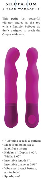 Selopa G Wow Pink G-Spot Vibrator from Evolved Novelties.Sex, love, passion. This petite yet powerful Vibrator angles at the top with a flexible, bulbous tip that is designed to reach the G-Spot with ease. 7 vibrating speeds and patterns. Specifications: made from phthalate free and latex free Silicone. Detail made from Black ABS Plastic. Size height 6 inches, depth 1.02 inches, width 1.02 inches. Insertable length 4 inches, insertable diameter 0.99 inch. Vibrator uses 1 AAA battery, not included. Splashproof for easy cleaning and shower play. 5 year warranty. Do not use oil base personal lubricants. These can corrode the toys materials. Care: clean product with toy cleaner or soap and water. Followed by a warm water rinse. Pat dry before storing. Categories: Vibrators, G-Spot Vibrator, G-Spot Flexible Vibrators. 2023.