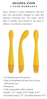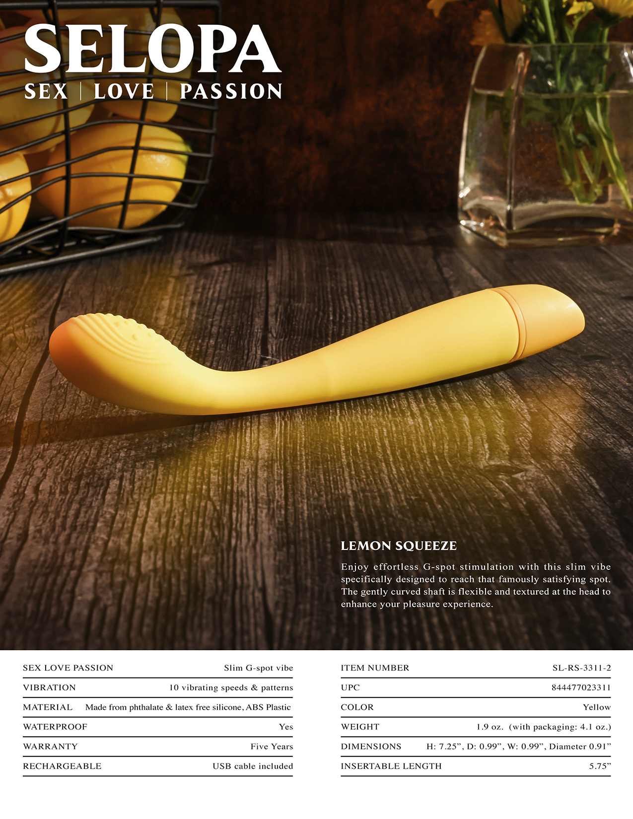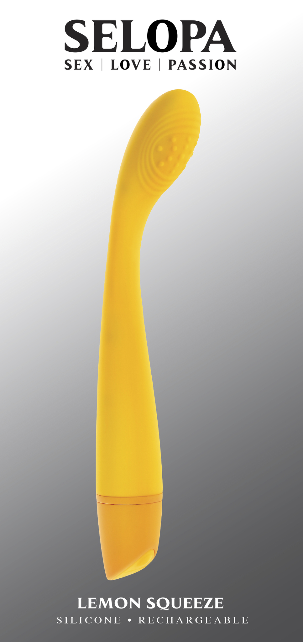 Selopa Love, Sex, Passion Lemon Squeeze Slim G-Spot Vibrator from Evolved Novelties. Enjoy effortless G-Spot stimulation with this slim Vibrator specifically designed to reach that famously satisfying spot. The gently curved shaft is flexible and textured at the head to enhance your pleasure experience. Specifications: 10 vibrating speeds and patterns. Made from body safe phthalate free and latex free Silicone. ABS Plastic base. Waterproof vibrations and submersible for play outside the bedroom. USB rechargeable, cable included. Size height 7.25 inches, depth 0.99 inch, width 0.99 inch. Insertable length 5.75 inches, insertable diameter 0.91 inch. Care instructions: clean product with an adult toy cleaner or soap and warm water before and after each use. Store this product in a clean, dry space preferably in a bag or box. Not touching other sex toys. Please note that oil based personal lubricants can corrode toys materials. Categories: Vibrators, Rechargeable Vibrators, G-Spot Vibrator, G-Spot Flexible Vibrators, Sex Toys for Women. 2023.