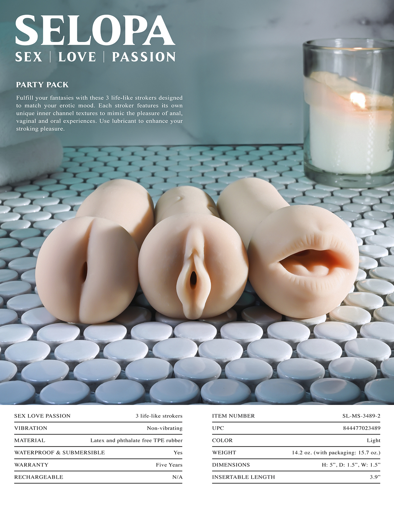 Selopa Party Pack Light Skin Tone 3 different strokers from Evolved Novelties. Fulfill your fantasies with these 3 life like strokers designed to match your erotic mood. Each stroker features its own unique inner channel textures to mimic the pleasure of anal, vaginal and oral experiences. Use a water lubricant to enhance your stroking pleasure. Specifications: each stroker is 5 inches in length. Made from body safe latex and phthalate free Thermoplastic Elastomers TPE Rubber. Care instructions: clean products with toy cleaner before and after use. Pat dry before storing. Store this product in a clean dry place. Perfectably in a dry, clean box. Not touching other toys. Please note that oil based lubricants can corrode toy materials. Categories: Masturbators, Masturbator Trios, Sex Toys for Men, Mouth Strokers, Pussy and Ass Strokers. 2024.