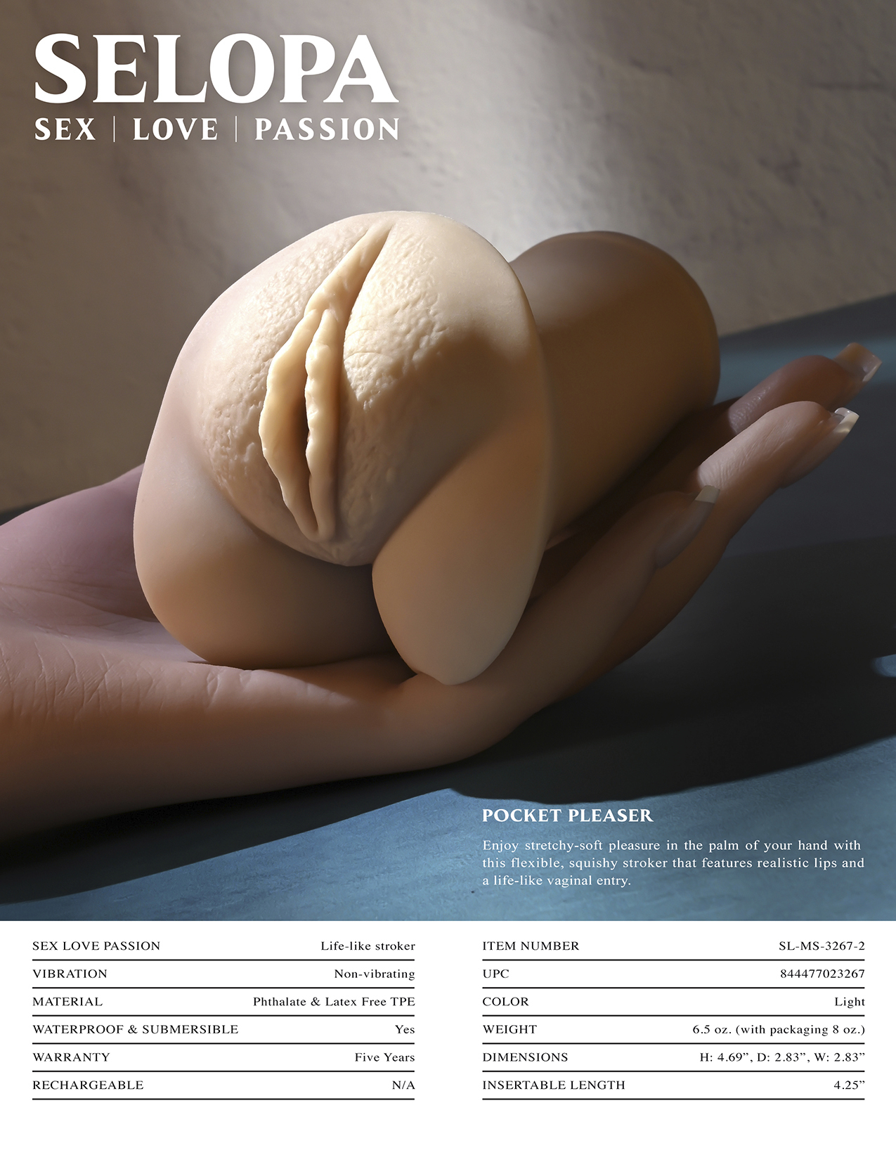 Selopa Pocket Pleaser Light Stroker from Evolved Novelties. Enjoy stretchy soft pleasure in the palm of your hand with this flexible, squishy stroker that features realistic lips and a life like vaginal entry. Specifications: Height 4.69 inches, Depth 2.83 inches, Width 2.83 inches. Made from phthalate free and latex free Thermoplastic Elastomers TPE. Penis ring Included. Waterproof. Care instructions: clean products with toy cleaner before and after use. Pat dry before storing. Store this product in a clean dry place. Perfectably in a dry, clean box. No touching other toys. Please note that oil based lubricants can corrode toy materials. Categories: Male Masturbators, Sex Toys for Men, Vibrating Cock Rings, Pussy Strokers, Solo Masturbators, Vibrators, Love Rings. 2024.