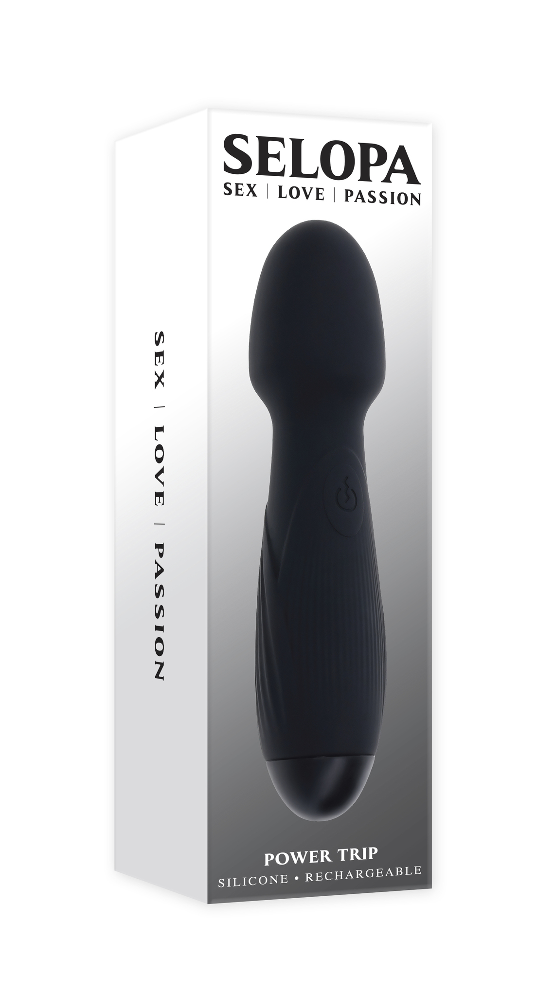 Selopa Power Trip from Evolved Novelties. Power Trip SELOPA SKU: SL-RS-4165-2. UPC: 844477024165. Experience the satisfaction of a stylish Silicone sealed wand that emanates powerful vibes from its flexible rounded head and rests easy in your hand with a solid, textured grip. Specifications: 6 vibrating speeds and patterns. Made from body safe phthalate free and latex free Silicone and ABS Plastic. Waterproof and submersible. USB Magnetic Rechargeable, cable included. Size Height 7.39 inches, Depth 1.78 inches, Width 1.78 inches. Insertable length 3 inches. Insertable diameter 1.78 inches. Categories: Vibrators, Eco-Friendly Sex Toys, Rechargeable Vibrators, Palm Size Massagers, Sex Toys for Women. 2024.