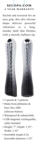 Selopa Silverado Vibrator from Evolved Novelties. Silverado Selopa SKU: SL-RS-4189-2. UPC: 844477024189. Description: stylish and textured for an easy grip, this chic chrome shape delivers powerful vibrations in a long, slender shaft that finishes with a smooth, bulbous tip. Specifications: 3 speeds and 7 patterns. Made from body safe materials phthalate free and latex free ABS Plastic, Silicone button. Waterproof and submersible. USB Magnetic Rechargeable, cable included. Size height 7 inches, depth 1.55 inches, width 1.55 inches. Categories: Vibrators, Classic Vibrators, Eco-Friendly Sex Toys, Rechargeable Vibrators, Sex Toys for Women. 2024.