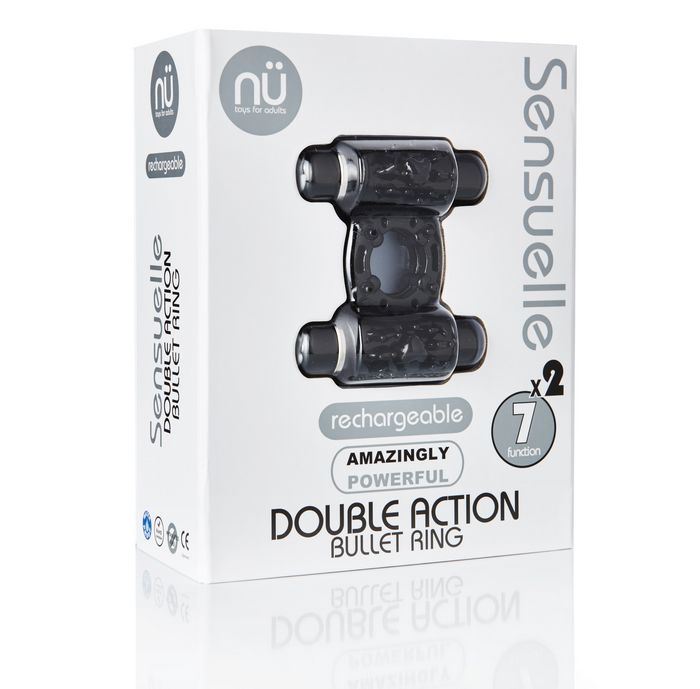 Sensuelle Double Action Black 7 function Vibrating Couples Cock Ring. Amazingly powerful. The Double Action is the perfect product for enhanced Couples’ play. With two independently controlled Bullets, this Cock Ring offers 49 interchangeable vibration combinations. The unique texture of this ultra stretchy, yet snug ring will consistently hit your most sensitive spots and compliment every movement and rhythm. Harness friendly and compatible with other products such as the Joie, Wireless Bullet Plus, and Ace, this Bullet Ring offers endless possibilities for those looking to shake things up in the bedroom. Features: 7 functions. 2 rechargeable bullet vibrators. Motors placed in center of Bullets for maximum vibration. Rechargeable from USB or wall charge. Charge time 2 hours per bullet. Running time 25 minutes to 50 minutes. Bullet material ABS Plastic coated in medical grade Silicone. Ring material Thermoplastic Rubber TPR. 100% waterproof submersible. ABS Plastic Bullet Vibrator. Size: 2.95 inches by 2.57 inches. Bulk weight .146 of a pound. Speeds + Pulsations: 3 speeds + 4 pulsations per bullet vibrator. Charge type: Magnetic USB via a port. Charging time: fully charged within 2 hours. User time: 25 minutes to 50 minutes. Interface: 1 button. 2 years warranty. Toy bag included. Colors available Black, Clear. Each sold separately. Categories: Love Rings, Couples Cock Rings, Love Rings, Rechargeable Vibrators. Restricted, Amazon Restricted. 2023.