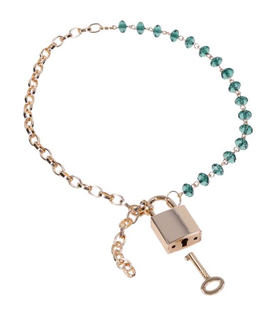 Slip on something that sparkles with meaning. The Indica Crystal Day Collar blends elegance with subtle submission, featuring green gem accents and a gleaming gold chain. The custom gold lock and key offer a sense of shared secrecylock it as a symbol of trust, ownership, or play. With an adjustable fit from 9″ to 20″, this collar can be worn snug at the throat or styled loosely as a statement piece.Features: Green gem details and gold chain for luxurious everyday wear Includes custom gold lock and key Adjustable fit from 9″ to 20″ for versatility and comfort