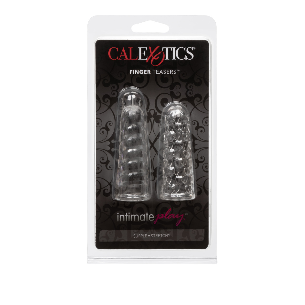 Intimate Play Silicone Finger Teasers from California Exotic Novelties. Enjoy new feelings of self gratification with the versatile Finger Teasers. The easy to use Finger Stimulation Sleeves are supplied in a pair for tantalizing erotic exploration that is limited only by your imagination. The contoured, stretch to fit Finger Teasers are textured and sensually swirled for maximized stroking, rubbing and stimulation ecstasy. The Finger Teasers are made from soft and supple, unscented phthalate free Thermoplastic Elastomers TPE. The exotic Fingertip arousers are sensually swirled and textured with love heart shaped pleasure nubs, for intensely satisfying sensuous tingles and sensations. Use with a water based personal lubricant for maximum enjoyment. Use with a water based personal lubricant for maximum enjoyment. Before and after every use, clean the finger arouser sleeves with mild soapy water or a toy cleaner spray. Finger Teasers are soft, stretch to fit, unscented, textured Finger Teasers. These Teasers are small super stretchy Finger extension or small vibrator Sleeve with external nubs. Teaser can be used on any finger on right or left hand. Small sleeve for bullet vibrator. Safe and pure for body and pleasure. Made using phthalate free, non-toxic materials unscented Thermoplastic Elastomers TPE. Tickler sleeve measures 3 inches long by 1 inch wide. Bumps sleeve measures 2.75 inches long by 1 inch wide. Always clean before and after use plus between partners. Finger Teasers is a registered trademark for California Exotic Novelties. Sex toys and sexual wellness. Categories: Sex Toys for Couples, Sensual Kits, Vibrator Sleeves, Batteries, Storage, Odds, Ends. 2023.