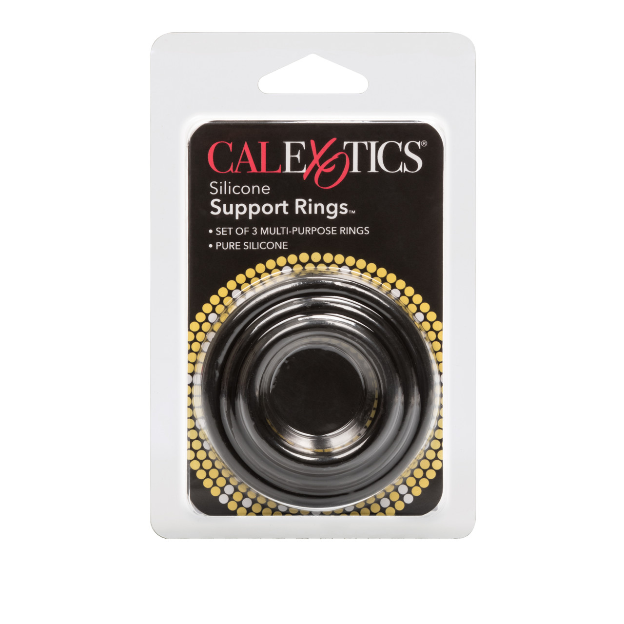 Silicone Support Rings Black 3 Piece Set from California Exotic Novelties. Elevate your seduction performance and intimate encounters with the Silicone Support Rings. The durable, stretchy erection enhancers are easy to use, comfortable to wear and perfect for self gratification pleasure and exotic couples fun. The multi-purpose adornment Rings are the perfect accessory for exploring your secret erotic fantasies and wild desires. The comfortable enhancers are made from unscented 100% pure Silicone and are supplied in a set of three. The medium, large and generous extra large. Cock Rings are designed for erection stimulation and stamina maintenance. The pliable, sleek and smooth Rings comfortably slip onto the erect penis for arousal and stimulation support, during intimate solo exploration and intimate couples pleasure. To increase sensitivity and to maximize and heighten the ecstasy, it is recommended that you always use a quality water based personal lubricant with this erection keeper sex toy. Perfect for discreet performance maintenance, the enhancer set are great for spontaneous play, and are ideal for first time and experienced users. The individual enhancer rings can be used alongside your favorite vibrating stimulator toys for extended enjoyment. Slip on your preferred stretchy ring size and prepare to indulge in endless tantalizing explosions. Before and after every use, clean the premium quality Silicone adornment rings with a toy cleaner spray, or wash in warm, soapy water. Rinse with warm water. Pat dry before storing. Medium, Large and Extra Large multiple purpose Rings. 100% Pure Silicone. Medium Ring measures 1.25 inches diameter, Large Ring measures 1.5 inches in diameter and Extra Large Ring measures 2 inches in diameter. Bulk weight 0.5 ounce. Safe and pure for body and pleasure. Made using phthalate free, non-toxic materials: Silicone. Do not wear a cock ring for more than 30 minutes. Cock rings give you a longer lasting erection by trapping the blood supply in the penis and intensify orgasms. Cock rings are ideal for men with premature ejaculation or erectile dysfunction. There are no guaranteed results from cock ring usage. Silicone Support Rings is a registered trademark for California Exotic Novelties. Sex toys and sexual wellness. Categories: Bondage, Fetish, Kink, Sex Toys for Couples, Men, Women, Love Rings, Cock Rings, Classic Cock Rings, Men’s Cock and Ball Gear. 2023.