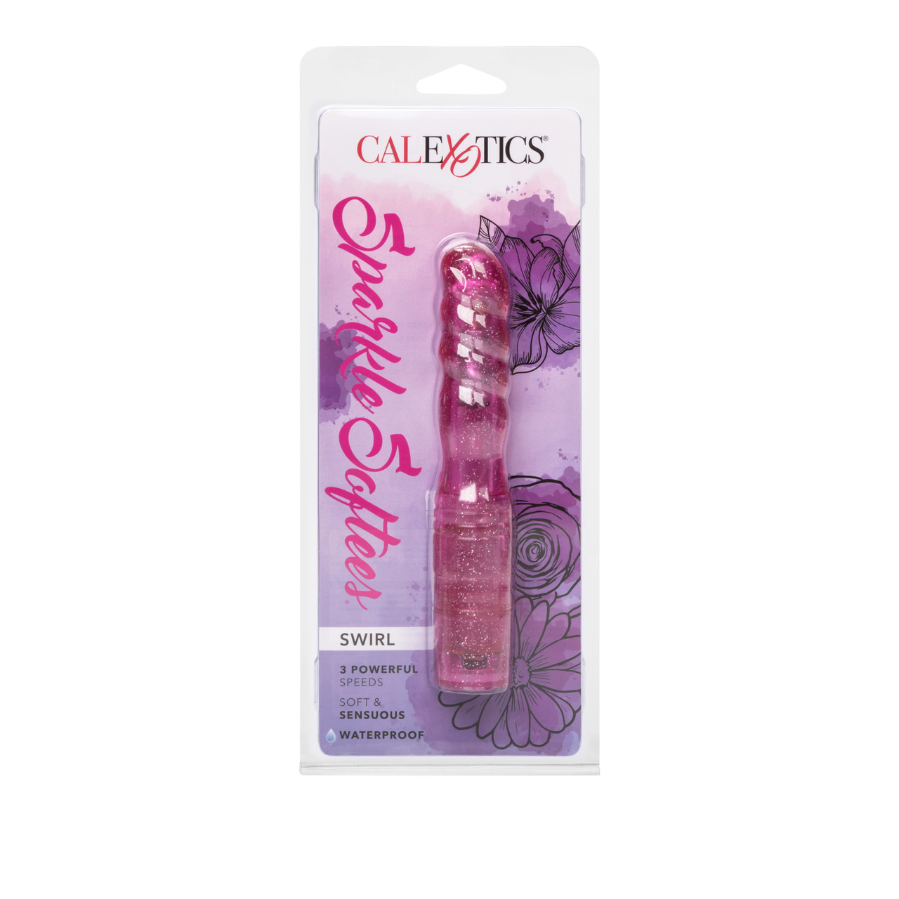 Sparkle Softees Pink Vibrator Swirl from California Exotic Novelties. Sensually swirled for your heightened pleasure, the exotic Sparkle Softees stimulator is super soft and power packed. The superior quality, multi-speed personal massager is waterproof for fun in or out of the water. The ultra soft and smooth vibe is made from hygienically superior unscented, Thermoplastic Rubber TPR and has a durable ABS Plastic End Cap and Sparkling Glittery Finish. The compact, easy to use massager measures 5 inches by 1 inch and has a flexible shaft with pleasure ridge swirl contoured design, and a pliable rounded tip. The power packed multi-speed arouser runs on 2 AAA batteries and has easy push button controls for speedy pleasure selection. Use the versatile, discreetly sized stimulator to massage intimate sweet spots and super sensitive erogenous zones. Perfect for first time and experienced users, the waterproof arouser is great for shower, bath or hot tub fun. Play on your own, or invite your lover to join in the tantalizing seduction. For increased sensitivity and intensified sensations, always use a quality lubricant with this toy. Clean the stimulator before and after every use. Wash the sensual swirled vibe in warm, soapy water, or clean with a toy cleaner spray. Superior quality! Soft and sensuous, waterproof vibrations. 3 speed power packed glittered massagers with convenient push button control. Safe and pure for body and pleasure. Made using phthalate free, non-toxic materials Unscented Thermoplastic Rubber TPR Shaft, ABS Plastic Base. Vibrator measures 5 inches long by 1 inch wide. Weighs 3.1 ounces. Vibrating sex toy requires 2 AAA batteries, not included. Do not leave batteries in the vibrator between uses. A water based lubricant is recommended. 1 year warranty. Package: 1.75 inches by 4.75 inches by 11.5 inches. Sparkle Softees Personality Vibrator is a registered trademark for California Exotic Novelties. Sex toys and sexual wellness. Categories: Vibrators, Classic Vibrators, Realistic Vibrators, Sex Toys for Women. 2023.