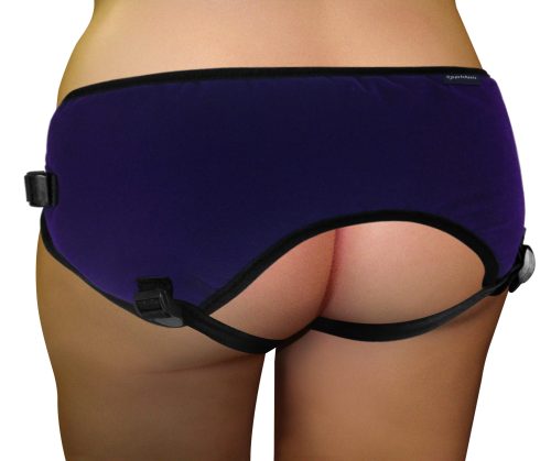 Sportsheets Plus Size Beginner’s Purple Strap On. Plush purple cushions your cute caboose.You deserve the royal treatment and this velvety purple harness delivers! We have got all your bases covered: easy accessibility with accommodating and adjustable 4-way straps, 3 interchangeable O-rings that give you the versatility to scale up as you and your partner get comfortable with new sizes, and even an enclosed channel that allows you to slip in a bullet vibrator for added stimulation. The luxurious material is plush and velvety so that your partner will not be able to keep their hands off of you. Find the perfect flared-base dildo and strap in, strap on, and get grinding! Handcrafted in the USA, this comfortable and attractive harness fits hips that are up to 72 inches in circumference, roughly sizes large to extra large. Features: plush purple fabric. 4 way adjustable straps fits size 12 to 30 and adjusts to 72 inches hips. Accommodates dildos with a flared base. Dildo not included. Includes interchangeable rubber o-rings: 1.5 inches, 1.75 inches, 2 inches. Includes channel for bullet vibrator, not included. Sold separately. Handcrafted in the USA. Machine washable. Includes: one beginner’s strap on harness. Materials: Polypropylene Webbing, Polyester Fabric, Polyurethane Foam, ABS Plastic, Nickel Free Metal Hardware, Brass Hardware, Nitrile. Limited Lifetime Warranty, Sportsheets will replace any defective product. If the product is not available, Sportsheets will replace it with a similar product of similar function. New package Curvy Collection. Video. 2021.