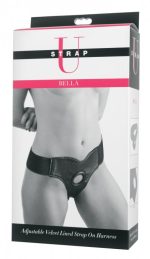 Strap U Velvet Lined Leather Strap On Black from XR Brands. With a wide elastic band and rear support panel, you can indulge in your strap on fantasies in style. Insert your favorite flared base dildo into the front panel, and slide Bella on like a pair of panties. The elastic waist band is comfortable, secure, and will stretch to fit. Features a velvet lining for the ultimate in comfort. This harness system is easy and fun to use, making this a comfortable choice for all your strap on adventures. Measurements fits hips between 29 inches and 39 inches in circumference. Hole measures 1.25 inches in diameter. Materials: Leatherette, Velvet. Color Black. Please note dildo not included. Sold separately. Categories: Naughty Role Play, Strap-Ons, Harnesses, Sex Toys for Women, Body Harnesses. 2023.