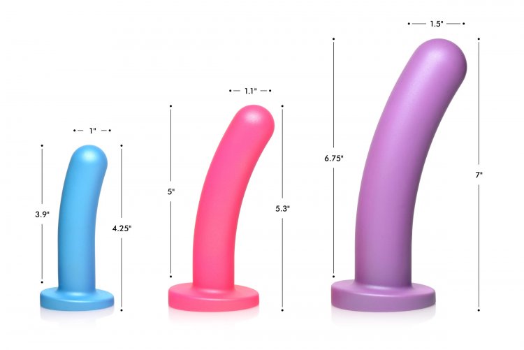 Strap U Triple Peg 28X Dildo Set Silicone with a Remote Control from XR Brands. Play with different sizes with this Triple Peg dildo set! The multi-colored dildos come in small, medium and large and each size has its own color so you can tell them apart at a glance! The Blue dildo, Pink dildo and Purple dildo are silky smooth, Premium Silicone that is phthalate free and body safe for worry free fun! The vibrating bullet can be inserted into any of the dildos at the base and is fully rechargeable via the magnetic USB charging cable included. Enjoy 4 speeds and 7 patterns of powerful vibration! To make things easy, a remote control is paired with the vibrator so you can adjust settings without ever having to take out or re-insert the vibrator. Have fun with pegging play with this triple dildo set! First, turn on the vibrating bullet and let it pair with the remote control. Insert into the dildo of your choice. After strapping either the small, medium or large dildo into your favorite harness, lubricate the dong well and use the same lubricant on your partner who is receiving the dildo. Go slowly as you play with size and girth, starting with the smallest dildo for beginners. Play with sizes as you both get more comfortable. Feel free to use the dildos on yourself, as well! Enjoy the powerful buzzing from Clean thoroughly between uses or use a condom to help keep things sanitary. After use, wash dildos with warm water and soap then spray with a toy cleaner and wipe dry. Recharge the bullet vibrator using the magnetic, USB cable provided. Replace remote control battery as needed. Measurements small dildo 4.25 inches overall length, 3.9 inches insertion length, 1 inch widest insertion diameter. Medium dildo 5.3 inches overall length, 5 inches insertion length, 1.1 inches widest insertion diameter. Large dildo 7 inches overall length, 6.75 inches. insertion length, 1.5 inches widest insertion diameter. Bullet Vibrator is 2.3 inches by 0.8 inch. Materials Silicone, ABS Plastic. Color Teal, Pink, Purple. Note Remote distance up to 32 feet; requires 1 CR2032 battery, included. Use with water based lubricant. Key features:Graduated Strap On sizes. Enjoy these three, graduated dildos sized small, medium and large and test out what feels best! Powerful Bullet Vibe. The removable bullet vibrator has 4 speeds and 7 patterns to choose from and is fully rechargeable using the magnetic USB charger included. Remote Control change settings without having to remove the vibe by using the remote control included! Premium Silicone: this silky smooth, phthalate free, Premium Silicone is body safe and is the preferred material for all sex toys. Please note harness shown on model, not included. Categories: Rechargeable Vibrators, Strap-Ons, Harnesses, Sensual Kits, Body Harnesses, Vibrator Kits. 2023.