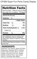 Super Fun Penis Candy in fun fruit flavors 100 pieces Point of Purchase POP Display from Candyprints. Delicious, tart fruit flavored, mini candy penises are more fun than a person should have! Bagged individual servings of tiny candy penises. Delicious tiny penis candy. One hundred 5 pieces clear bags per display carton. Point of purchase display colorful cardboard pop up with a colorful header. Super Fun Penis Candy from Candyprints. Party favors, adult candy. 19 calories per serving. Store out of reach of small children. Choking hazard. Amazing Penis Candy shaped candy from Candyprints. Categories: Party Games, Gifts, Supplies, Party Favors, Adult Party Favors, Adult Candy, Bachelorette Party Supplies – Candy. 2023.