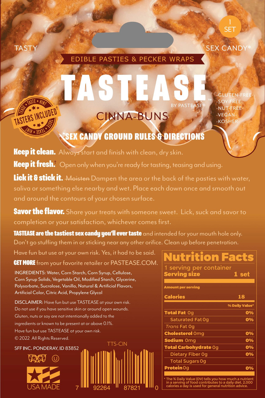 Tastease Cinna-Bun Edible Nipple Pasties and Pecker Wraps Sex Candy by Pastease Pasties. Tasty sex candy! Sex Candy rules and directions. Keep it clean. Always start and finish with clean, dry skin. Keep it fresh. Open only when you are ready for tasting, teasing and using. Lick it, stick it. Moisten dampen the area or the back of the pasties with water, saliva or something else nearby and wet. Place each down once and smooth out and around the contours of your chosen surface. Savor the flavor. Share your treats with someone sweet. Lick. suck and savor to completion or your satisfaction, which ever comes first. Tastease are the tastiest sex candy you will ever taste and intended for your mouth whole only. Do not go stuffing them in or sticking them near any orifice. Clean up before penetration. Have fun but use at your own risk, yes it has to be said. Edible Pasties, Pecker Wraps Cinna-Bun Sex Candy by Pastease Brands. Categories: Adult Candy and Erotic Foods, Lingerie, Clothing, Sexy Costume Accessories, Pasties and Accessories, Valentine’s Day Items. Restricted, Amazon Restricted. New primary image package. 2024.