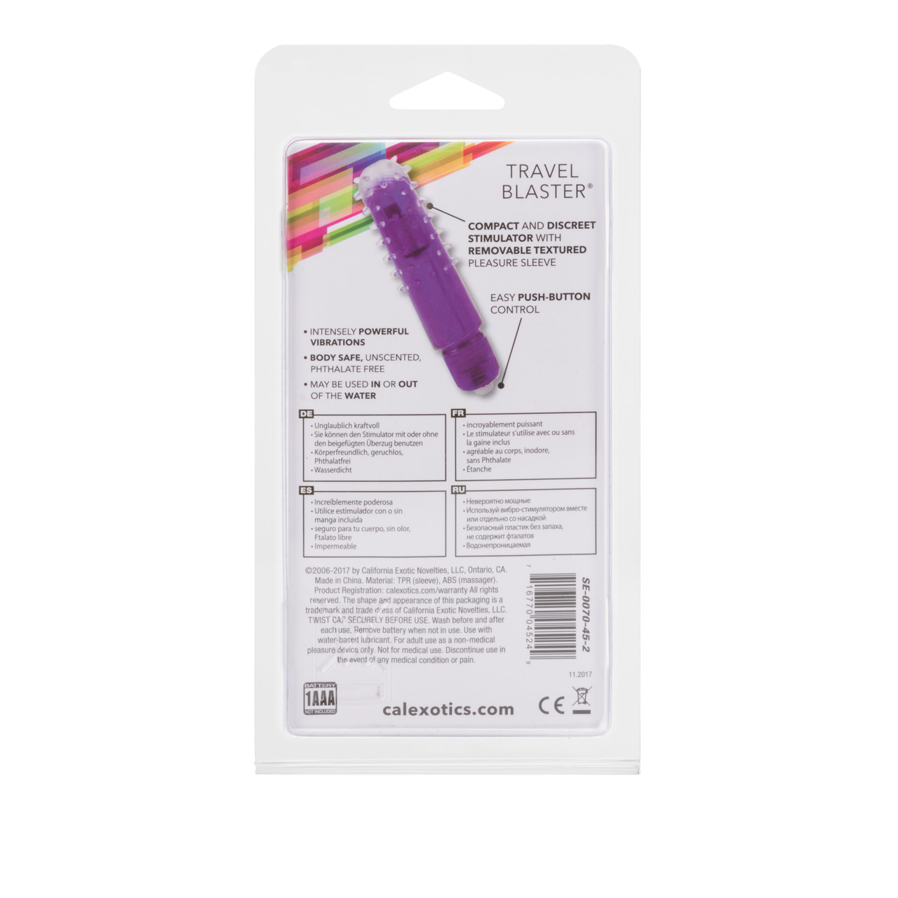 Waterproof Travel Blaster Purple Vibrator from California Exotic Novelties. The Waterproof Travel Blaster massager comes complete with a removable nubby sleeve for independent use, plus 30% more power than before! Feel the intense power of this small yet mighty adult toy and let the massager take you into lifes wet and wild moments with the most satisfying and tantalizing pleasure. Take into the bath tub for some alone time, take it into the shower for some steaming hot intimacy, or take it with you anywhere you want to get wet. It is 100% waterproof! Measuring a modest 3 inches long by 0.75 inch wide, this stylish and ergonomically designed massager makes the ideal travel product for those on the go. It is totally discreet so you can put it in any handbag or luggage bag for those naughty nights way or romantic weekend getaways with a loved one. The compact makes it a great starter product for first time users who want something that is both waterproof and packed with intense power, and the removable textured sleeve gives you so much versatility. With a simple push button control, this waterproof toy is so easy to handle, making it a simple go to product during foreplay. The massager is compatible with high quality lubricants such as our Universal Lube and it can be cleaned easily after each use. Waterproof Travel Blaster with pleasure carrying this small massager. Comes with a removable spiky sleeve is hygienically superior. The sleeve is has raised nubs to tickle and tease you. Easy to use push button control. Waterproof for fun in or out of the water. Requires 1 AAA battery, not included. Made using phthalate free, non-toxic materials: ABS Plastic Bullet Vibrator, Thermoplastic Rubber TPR sleeve. Vibrator measures 3 inches long by .75 inch wide. 1 year warranty. Waterproof Travel Blaster is a registered trademark for California Exotic Novelties. Sex toys and sexual wellness. Categories: Vibrators, Bullets, Eggs, Sex Toys for Women, Vibrating Bullets and Eggs. 2023.