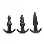 Trinity Vibes 4 Piece Vibrating Anal Plug Set Black from XR Brands. Excellent for adventurous beginners to backdoor play, this vibrating anal plug set includes three stimulating shaped plugs and a buzzing bullet vibe. Explore anal pleasure with 10 modes of vibration, including 3 speeds and 7 pulsating patterns. Just slide the petite bullet vibrator into the base of the plug you want to play with, whether you feel like a classic shape, an exciting bulb or three pops of pleasure. Each plug is smooth and tapered for your comfort. The easy to use button operation makes play time hassle free and the contoured bases keep each plug safely in place between your cheeks. This firm, yet flexible material is phthalate free and compatible with water based and silicone lubricants. The bullet is even waterproof for easy cleaning or use in the shower. Measurements: bulb butt plug is 4 inches in total length, 3.75 inches insertion length, 1.25 inches maximum diameter. Ribbed butt plug is 4.25 inches in total length, 4 inches insertion length, 1.25 inches maximum diameter. Classic butt plug is 4.75 inches in total length, 4.5 inches insertion length, 1.25 inches maximum diameter. Materials Butt plugs are made using Thermoplastic Rubber TPR, Bullet vibrator is made using ABS plastic. Color Black. Note bullet vibrator requires 3 AG13/LR44 batteries, 6 are included. Categories: Anal Toys, Sensual Kits, Vibrator Kits, Anal Trainer Kits. 2023.