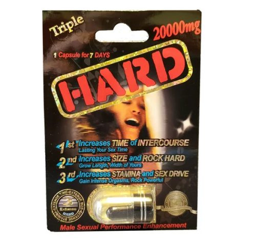 Triple Hard 1 Piece Capsule for Male Sexual Performance Enhancement. 1 capsule for 7 days. Triple Hard, Triple Maximum, Time plus Size plus Stamina. Specifications: increase the time of intercourse. Free from premature ejaculation. Better ejaculation control, no limits. Increase volume of ejaculate. Amazing increase in thickness. Increase in length, width and stamina. Experience rock hard erection. Increases sexual confidence. Increases intense, explosive orgasms. Male enhancement. All Natural! Male Enhancement. No prescription necessary. Doctor designed. Suggested use: as a dietary supplement take one (1) capsule 30 minutes prior to sexual activity with water. Caution: do not use more than one capsule every 60 hours. Not for use by individuals under the age of 18. Supplement facts: Tribulus Terrestirs, Lyco-Pene, L’Arginine, Damiana Leaf, Guarana, Yohimbe, Maca, Vitamin B12, Vitamin C, Vitamin D3, Zinc Oxide. These statements have not been evaluated by the Food and Drug Administration. This product is not intended to diagnose, treat, cure, or prevent any disease. Made in the USA. Please note sold as a single unit shown as a display. 1 capsule only. Categories: Meds, Supplements, Sex Pills, Male Enhancement, Sex Toys for Men, Health and Beauty Aids.