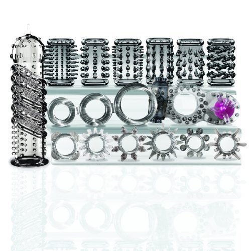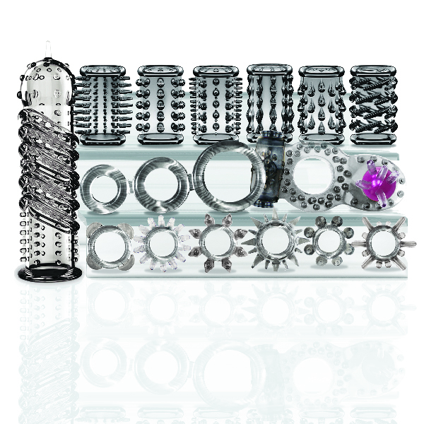 Try Curious Cock Ring and Sleeve Set from Icon Brands. With 15 style of cock rings and sleeves many styles to choose from. 6 transparent sleeve, 6 unique penis rings, 1 full size sleeve. Made using body safe materials Thermoplastic Rubber TPR. Textures include studded, swirled spiky and much more.