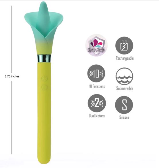 Maximize your pleasure with the Vala Silicone Flower Vibrator, where Flower Power meets luxurious softness. Featuring our Dual Jaguar Motor Drive, you can independently control the stem and petal stimulator for a customized experience. With 5 speeds and 5 variable vibration patterns, this vibrator is designed to cater to your every desire, ensuring that every moment is uniquely satisfying.Crafted from body-safe silicone and fully submersible, the Vala is perfect for both solo adventures and romantic baths. The Stem of the Vala is flexible and contours with your body. Plus, it comes with a Pleasure Promise Warranty for peace of mind. Rechargeable and complete with a cable, this delightful flower is ready to bloom whenever you are. Indulge in the ultimate pleasure experience today!FEATURES: Dual Jaguar Motors, Silicone + ABS Plastic, Rechargeable, 5-Speed + 5 Variable Vibration Levels, Flexible Stem, Length = 8-3/4 inch, inch Diameter, Submersible, Charging Cable Included, Pleasure Promise WarrantyOperating InstructionsThe Top Button operates the Flower Stimulator.The Bottom Button operates the Stem Stimulator.Press and hold the Control Button for 3 seconds to activate the stimulator. The light will turn on.Press the Control Button to cycle through the 5-Speeds and 5-Variable Settings.Press and hold the Control Button for 3 seconds to turn off the unit. Charging InstructionsLocate the Magnetic Charging Port. It is located on the middle of the stem. Attach the Magnetic Cable to the Charging Port.The light will flash when charging.Charging is complete when the light turns solid.