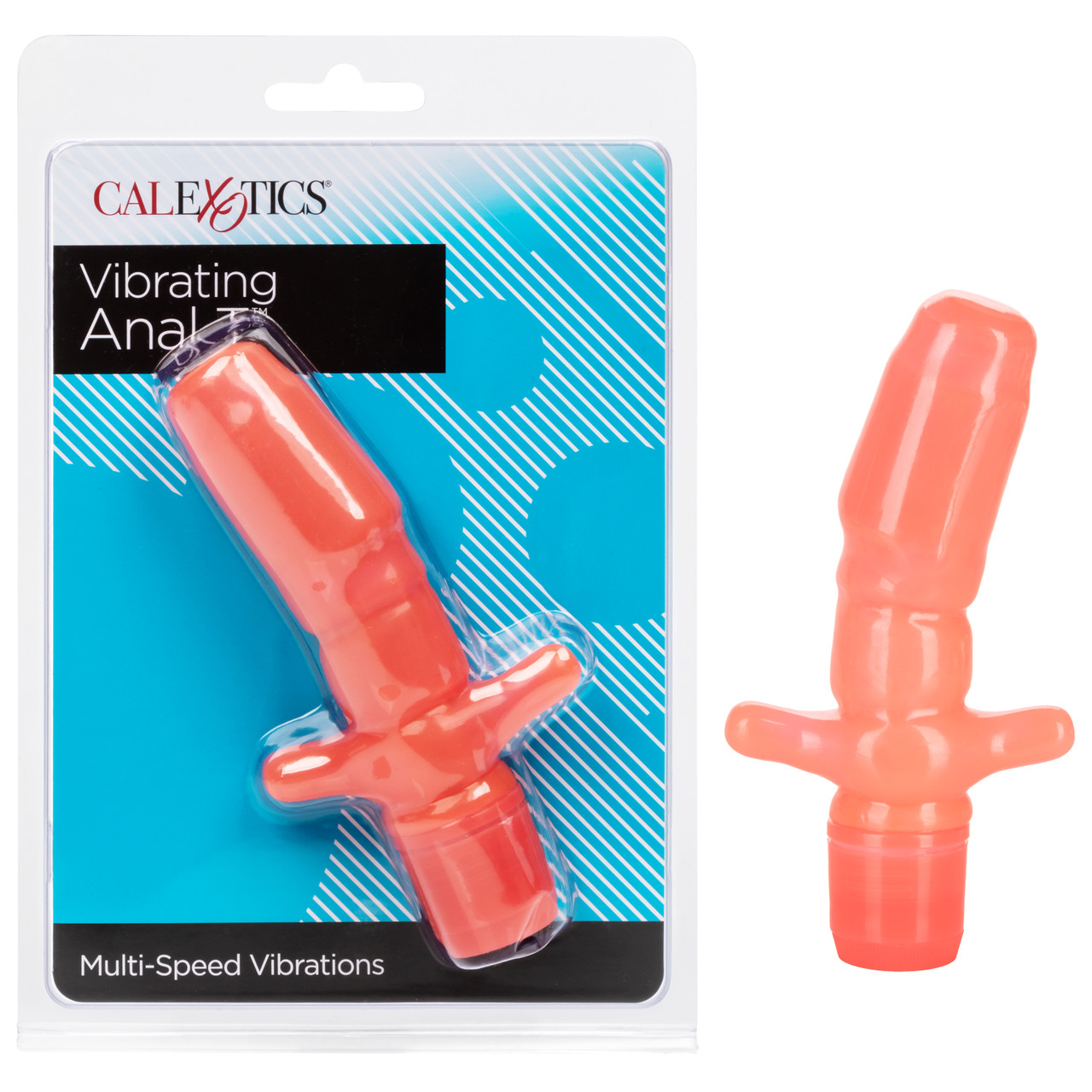 Vibrating Anal T 3.25 inches from California Exotic Novelties is a powerful jelly coated anal stimulator angled for prostate stimulation with cross bar at bottom to prevent inserting it too far. Classic vibrator features a twist bottom power control. Enjoy tantalizing orgasmic tingles and intense satisfaction with the Vibrating Anal T. The soft and pliable, contoured jelly vibe is designed for ultimate anal exploration and ultimate pleasure. Tease, please and massage your ultra sensitive zone with this multi-speed power packed penetrator. The safe and easy to use massager makes a great addition to your experimental intimate toy collection. This super soft, jelly coated stimulator measures a discreet 3.25 inches by 1 inch and boasts intense multi-speed power and superior vibrating action. Made from unscented, phthalate free PVC, the compact Anal Vibrator has a contoured shaft with angled tip, and two flexible ticklers that make it safe for pleasurable penetration play. The easy to use personal massager is powered by one AA battery, and simply requires a twist on the cap to get the party started. Adjust the speed to match your sexual mood, and enjoy an unforgettable exotic experience. This arouser is suitable for first time and experienced users. To increase your erotic satisfaction it is recommended that you always use a quality lube with this toy. Explore your wildest dreams and fantasies, and experience intense gratification with this pliable anal pleasure tool. Before and after use, remember to clean the vibrating vibe with a toy cleaner spray, or warm soapy water. Vibrating anal sex toy requires 1 AA battery, not included. Do not leave battery in the vibrator between uses. Probe measures 3.25 inches long by 1 inch wide. Bulk weight 2.2 ounces. A water based lubricant is recommended. Always clean before and after use. Vibrating Anal T is a registered trademark for California Exotic Novelties. Sex toys and sexual wellness. Categories: Anal Toys, Prostate Massagers, P-Spot Stimulators, Probes, Sticks, Rods, Vibrators, T-Plugs. 2023.