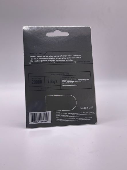 X Enhancement Pill Single for male sexual enhancement. How to use: take one capsule one hour before intercourse to help maximize performance. Can also be used on a regular bases to maintain optimal conditions of readiness. Take one hour apart from taking other supplements or medications. Ingredients: Tribulus Terrestrus, Lycepene, L-Arginine, Diamana Leaf, Guarana, Yohimbe, Maca, Vitamin B12, Vitamin C, Vitamin D3, Zinc Oxide. X Ultra sexual enhancement. Enhanced performance. Increased stamina. Warnings, cautions: consult a physician if you have health issues or undesirable effects. Store in a cool, dry place, or taking with other medication. It is not recommended and should be avoided. Do not take more than one capsule every 60 hours. These statements have not been evaluated by the Food and Drug administration. This product is not intended to diagnose, treat, cure or prevent any disease. Daily value not established. Categories: Meds, Supplements, Sex Pills, Sex Toys for Men, Health and Beauty Aids. Made in the USA. 2024.