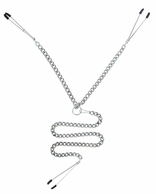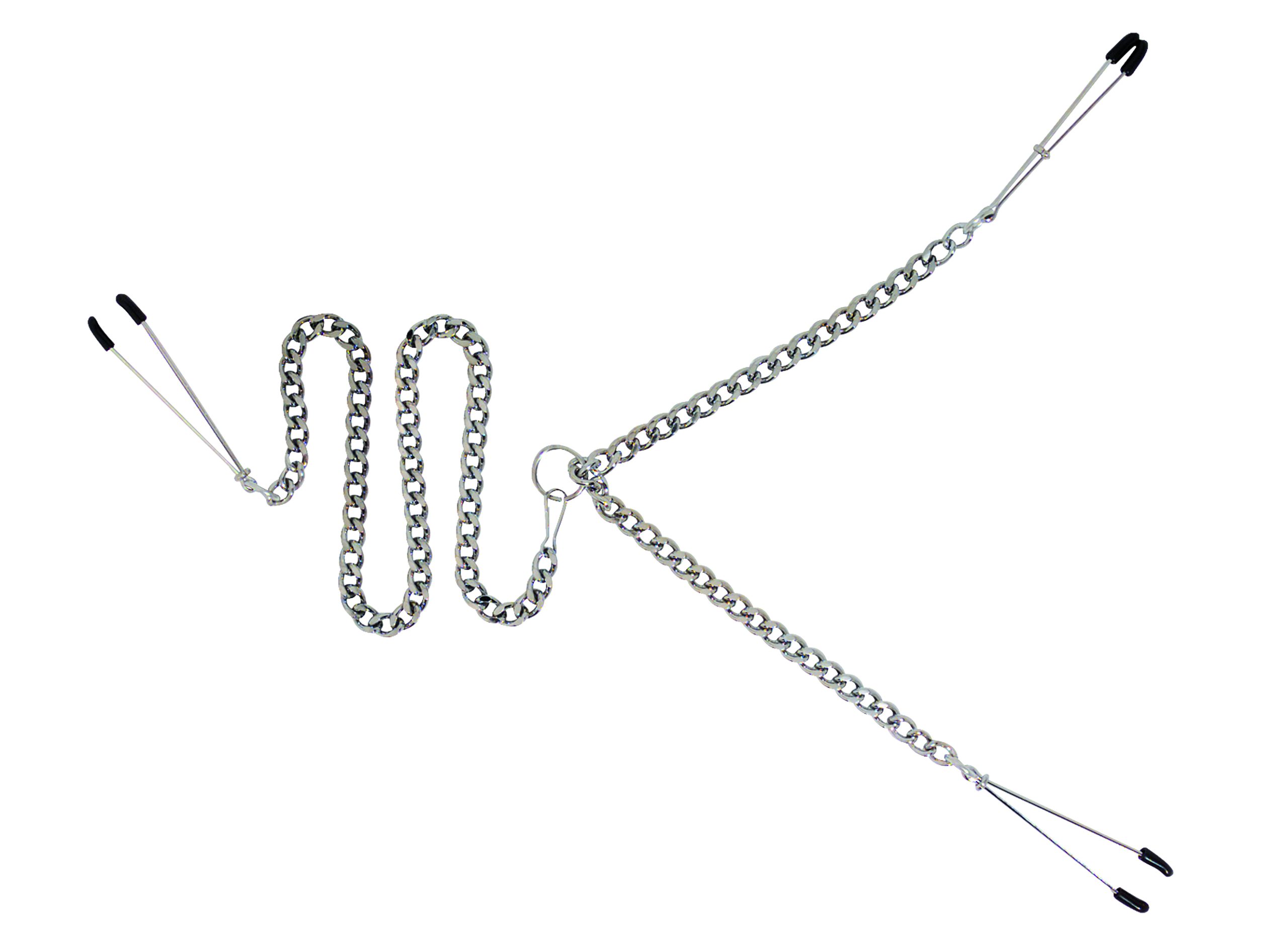 Y-Style Nipple Clamps a detachable clit clamp makes these clamps versatile and tempting. Experience pain and pleasure in several erogenous zones at once with this devilish beauty. The Y-Style Nipple Clamp set from Spartacus uses rubber-tipped tweezer clamps on both the nipples and clitoris for amazing sensation with every movement of the wearer. A jewel-link chain adds a touch of erotic weight and connects the three clamps for sensual synergy. The clamps are all adjustable by moving the small ring up or down, providing the perfect fit for any wearer. The rubber tips can be removed if more sensation is needed. Color: Black, Silver. Type: Nipple and Clitoris Clamp Set. Material: Metal, Rubber Special Features: Adjustable. Y-Style Nipple Clamps Tweezer with Clitoral Clamp from Spartacus Leathers A Passion For Quality Catalog page 14.