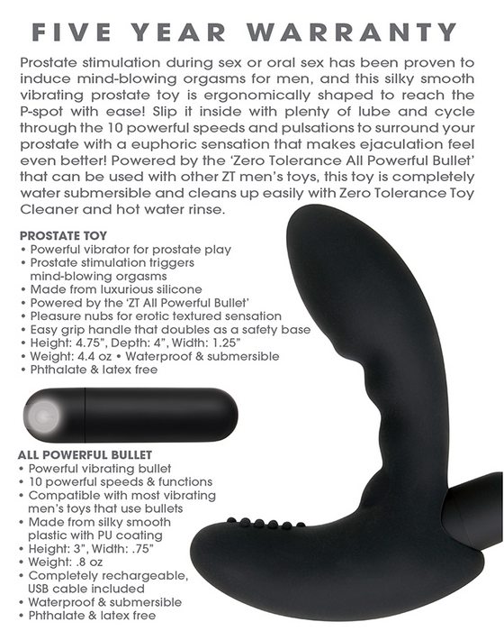 Eternal P-Spot Black Prostate Massage from Zero Tolerance. Prostate stimulation during sex or oral sex has been proven to induce mind blowing orgasms for men, and this silky smooth vibrating prostate toy is ergonomically shaped to reach the P-spot with ease! Slip it inside with plenty of lube and cycle through the 10 powerful speeds and pulsations to surround your Prostate with a euphoric sensation that makes ejaculation feel even better! Powered by the Zero Tolerance All Powerful Bullet that can be used with other Zero Tolerance mens sex toys, this toy is completely water submersible and cleans up easily with Zero Tolerance Toy Cleaner and hot water rinse. Prostate Massager features: powerful vibrator for Prostate play. Prostate stimulation triggers mind blowing orgasms. Made from luxurious Silicone. Powered by the Zero Tolerance All Powerful Bullet Vibrator. Pleasure nubs for erotic textured sensation. Easy grip handle that doubles as a safety base. Size height 4.75 inches, depth 4 inches, width 1.25 inches. Bulk weight 3.9 ounces. Waterproof, completely submersible. Phthalate free and Latex free. All Powerful Rechargeable Bullet. Powerful Vibrating Bullet. Compatible with most vibrating mens sex toys that use bullets. Use on its own to enhance sensation on any erogenous zone. 10 powerful speeds and functions. Made from silky smooth ABS Plastic with a Polyurethane PU coating. Completely rechargeable, USB cable included. Waterproof, completely submersible. Features a powerful 10 speed bullet vibrator. Rechargeable via USB. USB cable included. 10 speeds. Waterproof vibrations. Made using Silicone Sleeve, ABS Plastic Bullet Vibrator. Phthalate free. Latex free. Size 4.75 inches by 4 inches by 1.25 inches. Bulk weight 4.4 ounces. 5 years warranty from Zero Tolerance. Categories: Prostate Massagers, P-Spot Stimulators, Prostate Massagers, Vibrators, Rechargeable Vibrators. New Video. 2024.