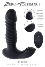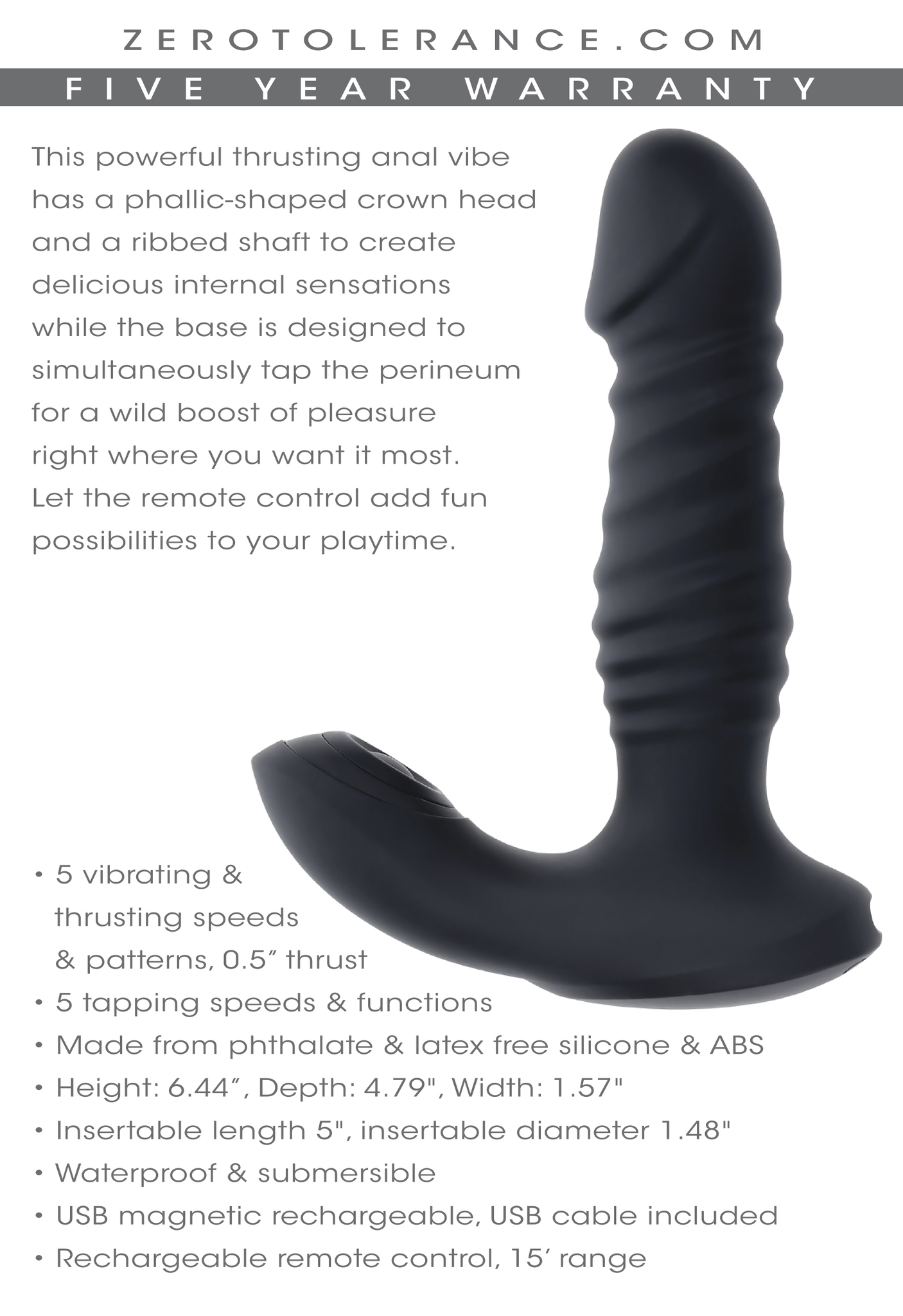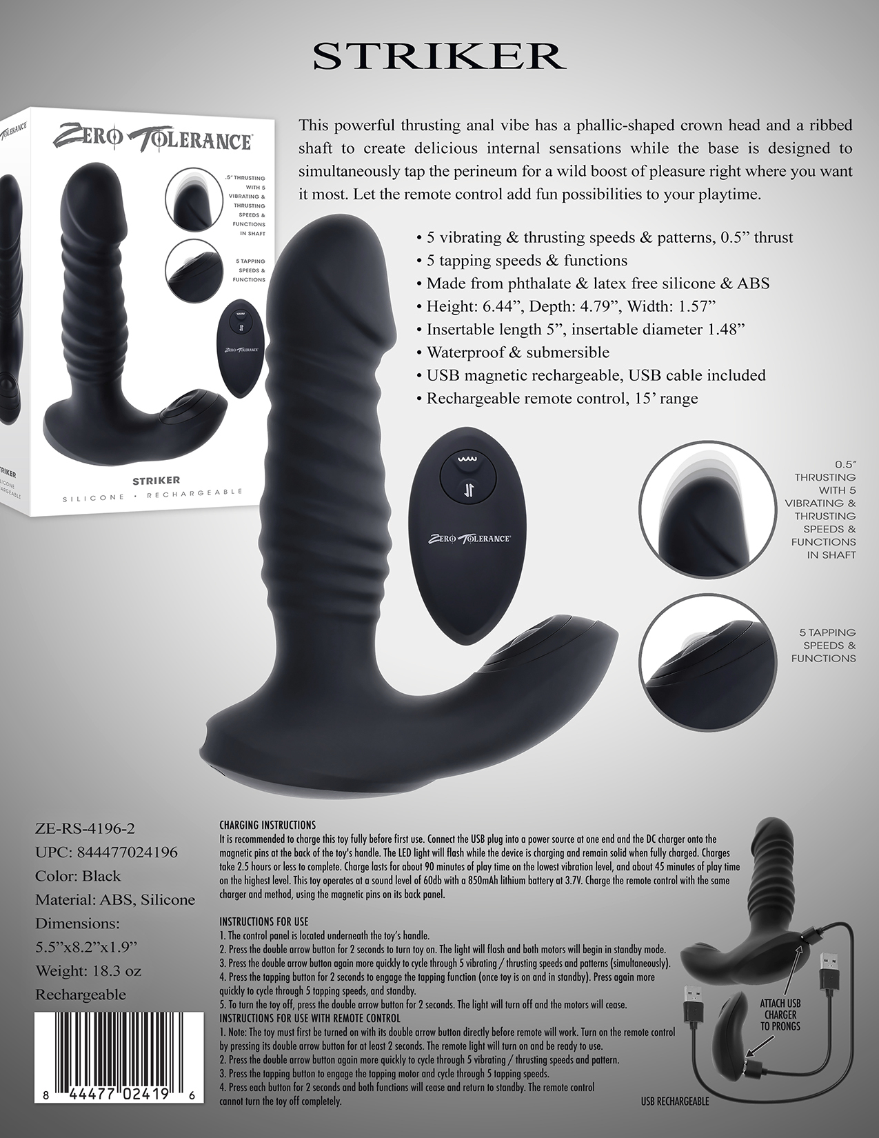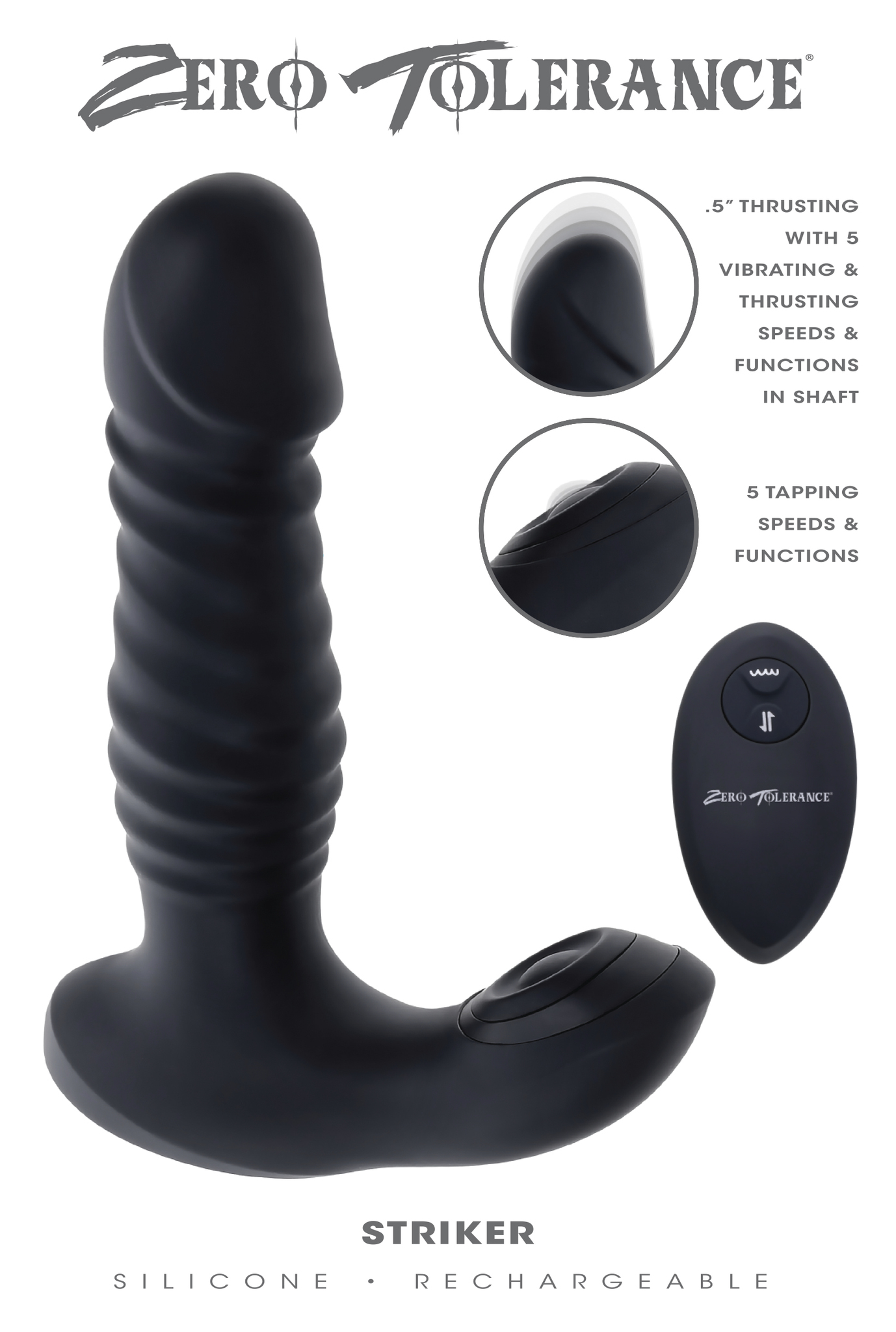 Zero Tolerance Striker Black Anal Vibrator from Evolved Novelties. This powerful thrusting Anal Vibrator has a phallic shaped crown head and a ribbed shaft to create delicious internal sensations while the base is designed to simultaneously tap the perineum for a wild boost of pleasure right where you want it most. Let the remote control add fun possibilities to your play time. Features: 5 vibrating and thrusting speeds plus patterns, 0.5 inch thrust . 5 tapping speeds and functions. Made from phthalate free, latex free Silicone and ABS Plastic. Size Height 6.44 inches, Depth 4.79 inches, Width 1.57 inches. Insertable length 5 inches, insertable diameter 1.48 inches. Waterproof and submersible vibrator. USB Magnetic Rechargeable, USB cable included. Rechargeable remote control 15 feet range. Categories: Anal Toys, Prostate Massagers. P-Spot Stimulators, Sex Toys for Men, Eco-Friendly Sex Toys, Rechargeable Vibrators. 2024.